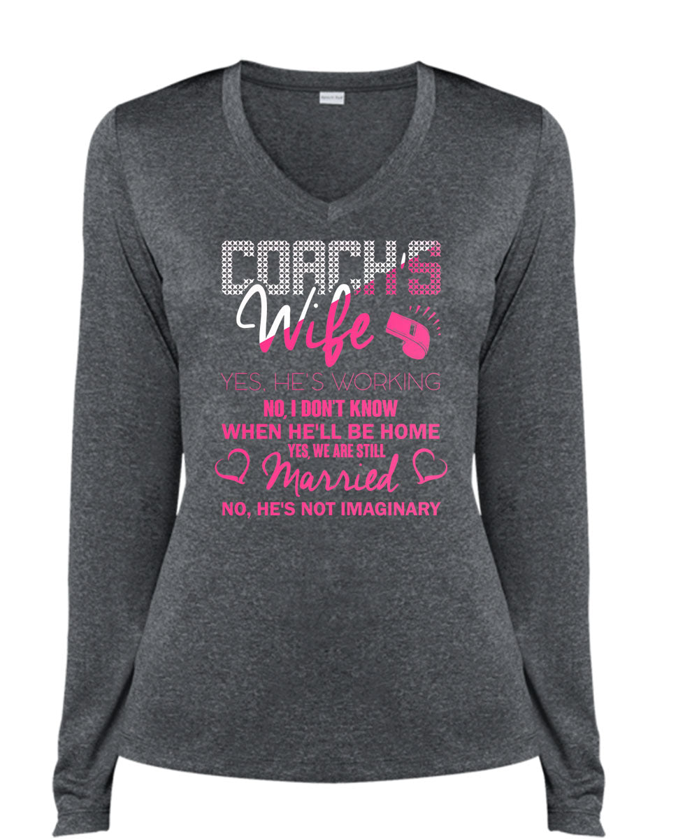 Coach's Wife He's Working T Shirt, We Are Still Married T Shirt, Cool Shirt (Ladies LS Heather V-Neck)