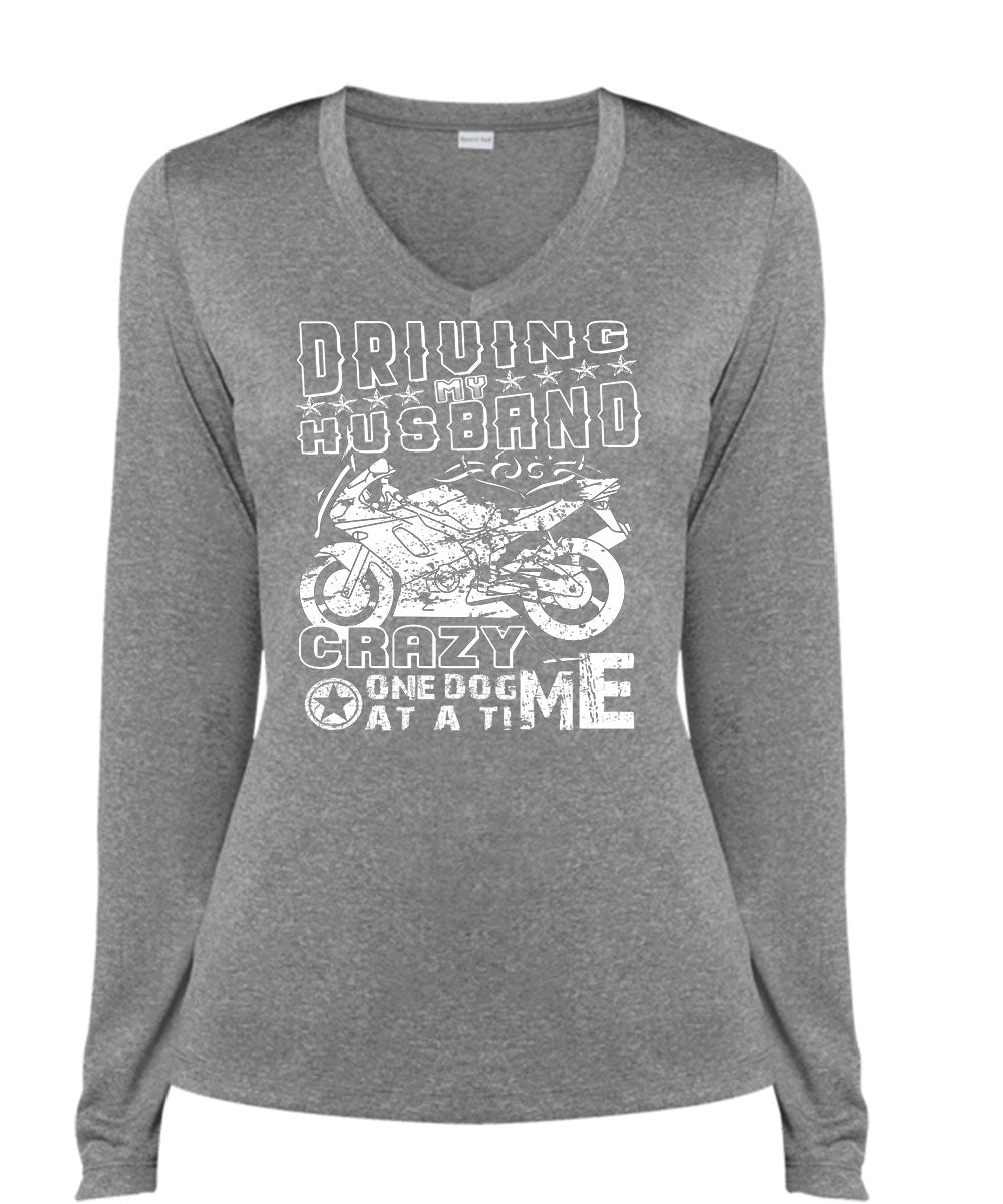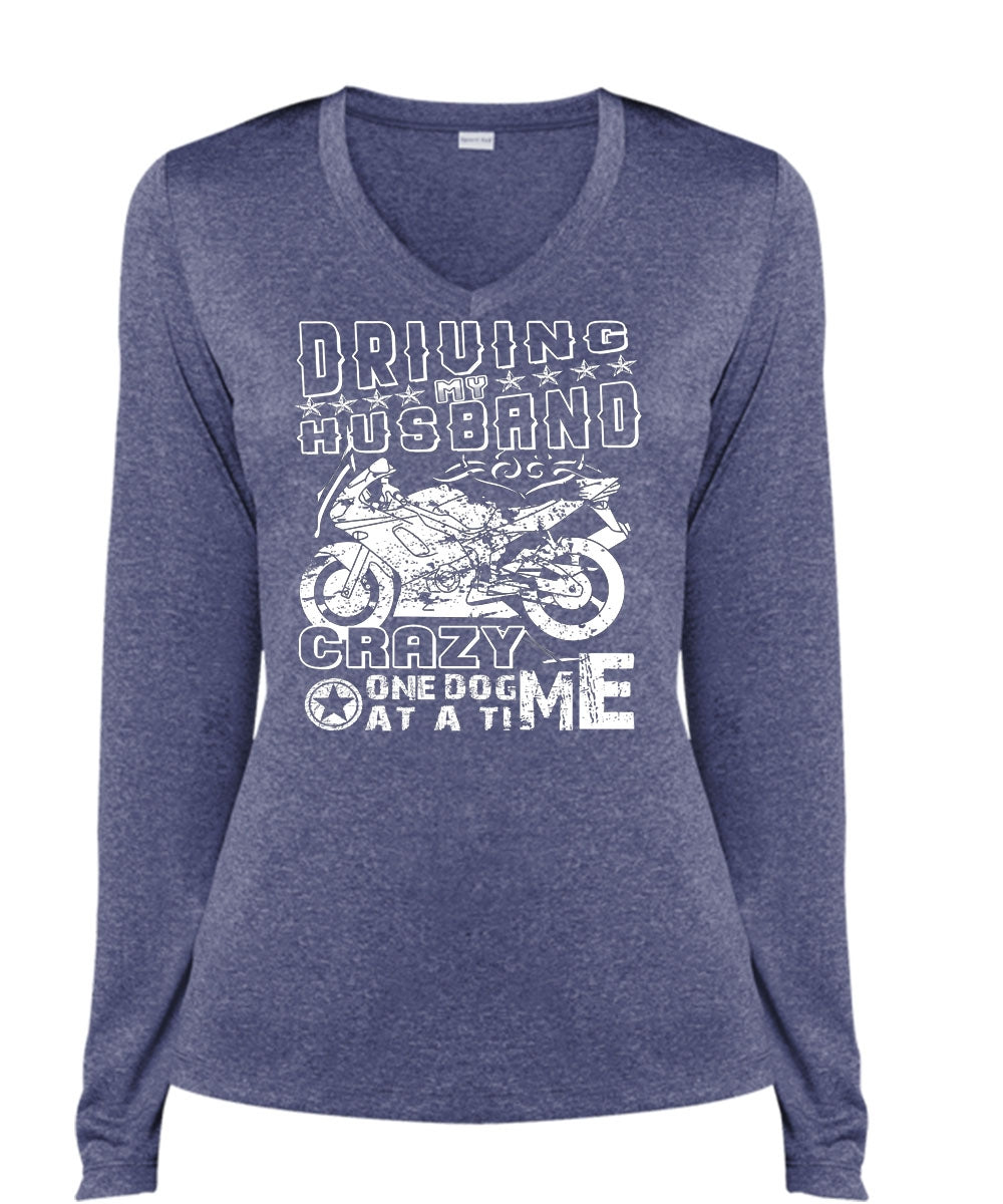 Driving My Husband Crazy One Dog At A Time T Shirt, I Love Biker Shirt (Ladies LS Heather V-Neck)