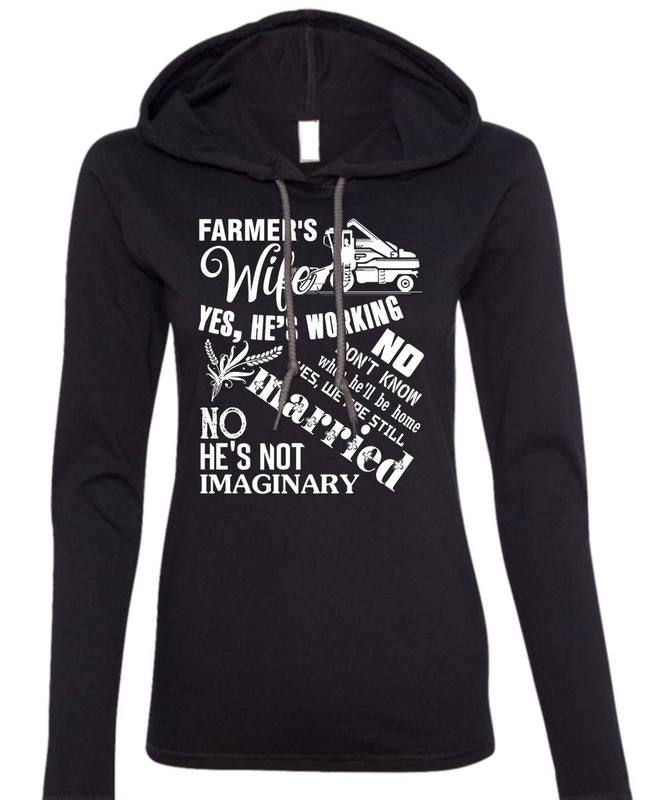 Farmer's Wife Yes He's Working T Shirt, We Are Still Married T Shirt (Anvil Ladies Ringspun Hooded)