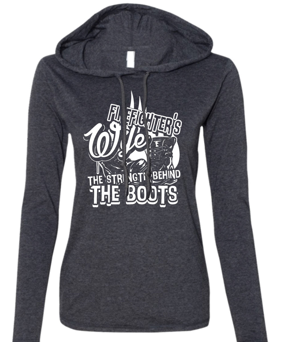 Firefighter's Wife T Shirt, The Strength Behind The Boots T Shirt (Anvil Ladies Ringspun Hooded)