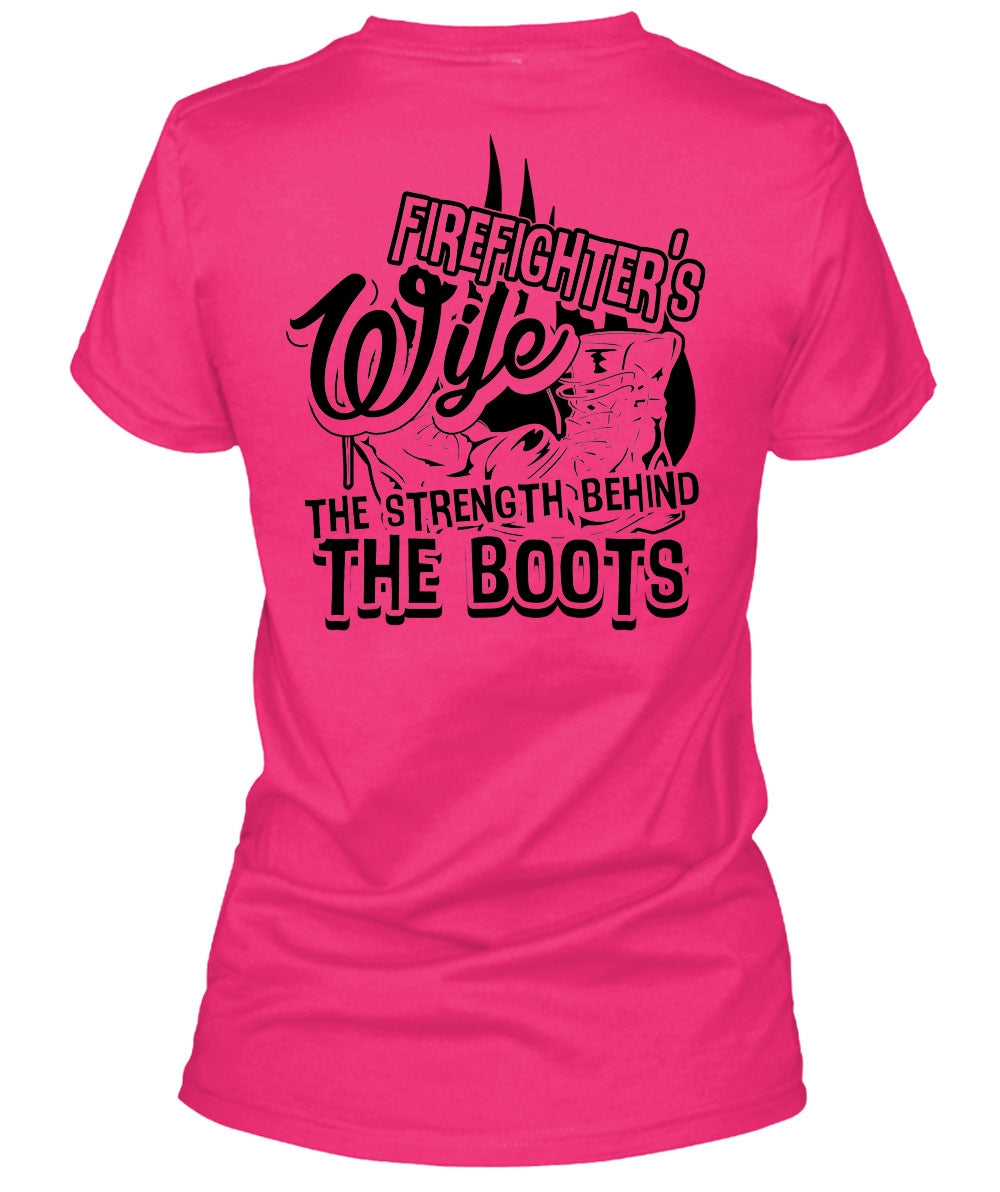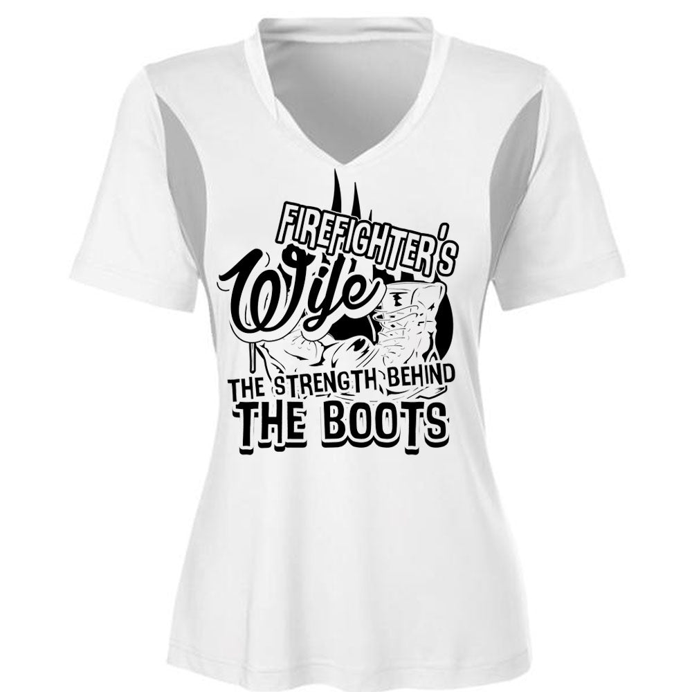 Firefighter's Wife T Shirt, The Strength Behind The Boots T Shirt, Cool Shirt (Ladies LS Heather V-Neck)
