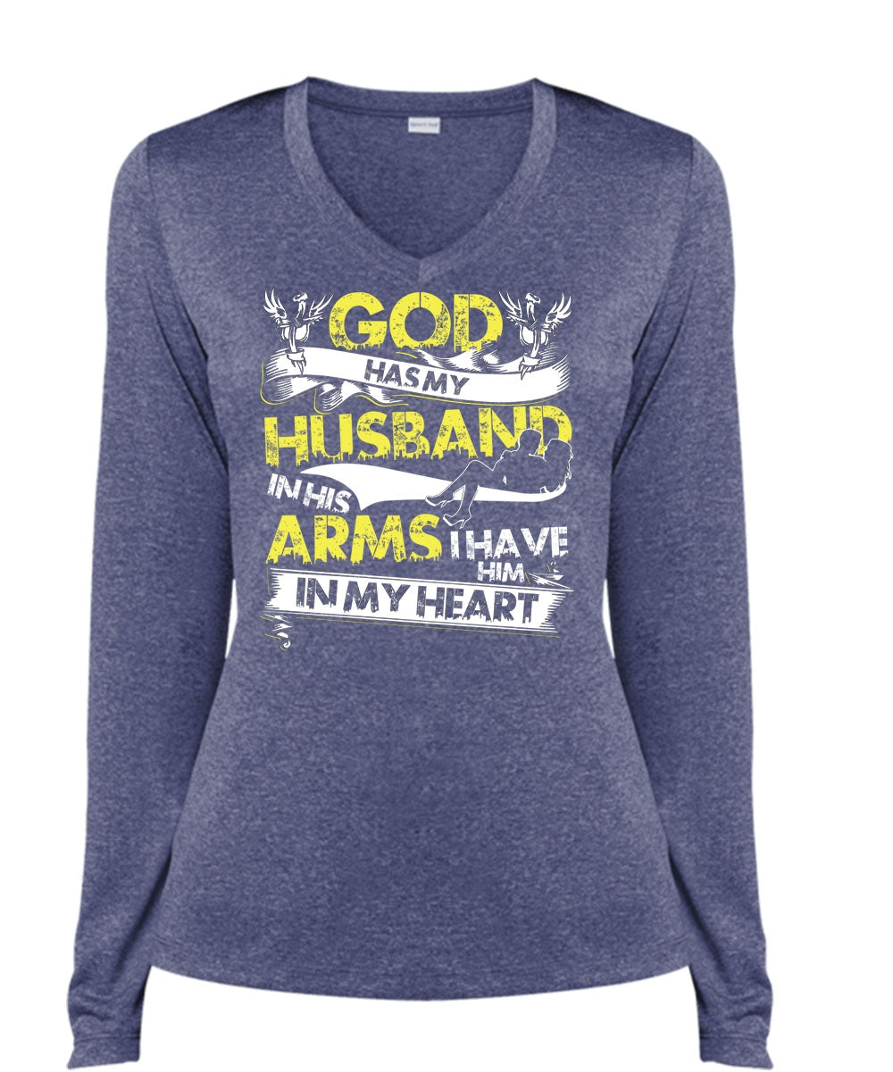 God Has My Husband T Shirt, I Have Him In My Heart T Shirt, Cool Shirt (Ladies LS Heather V-Neck)