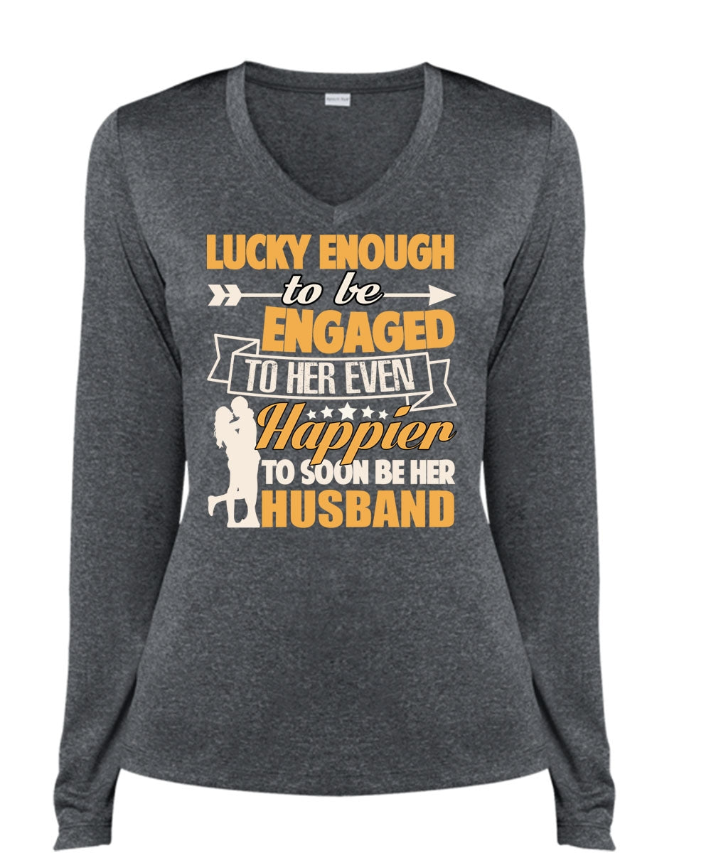 Happier To Soon Be Her Husband T Shirt, Lucky Enough To Be Engaged T Shirt, Cool Shirt (Ladies LS Heather V-Neck)