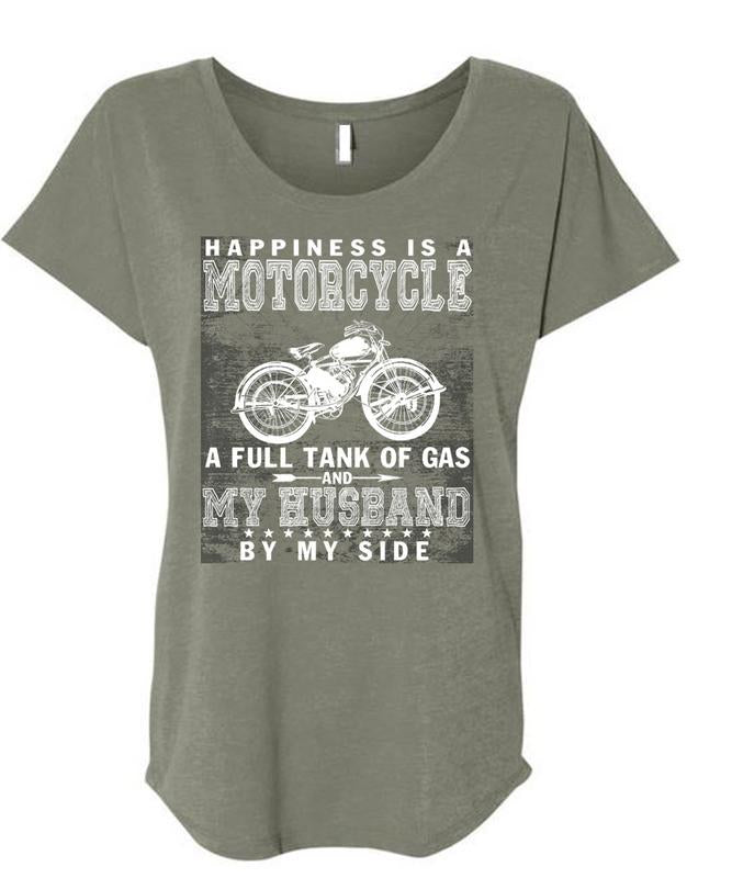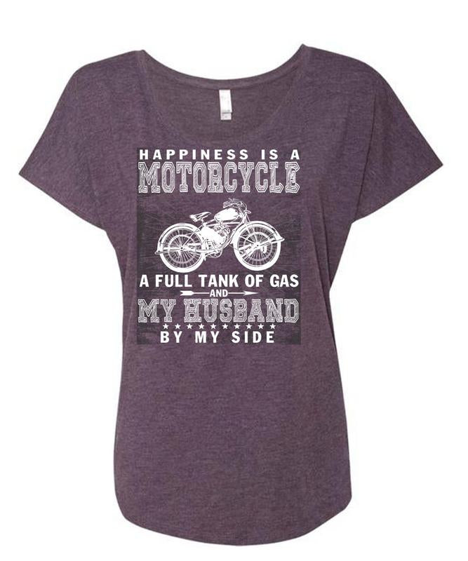 Happiness Is A Motorcycle T Shirt, My Husband By My Side T Shirt, Cool Shirt (Ladies' Triblend Dolman Sleeve)