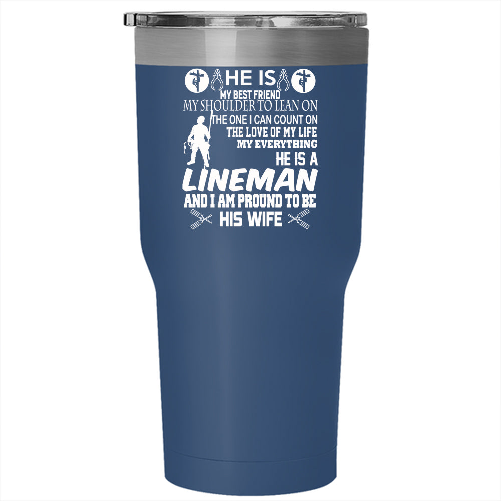 He Is A Lineman Tumbler 30 oz Stainless Steel, I Am Phoud To Be His Wife Travel Mug