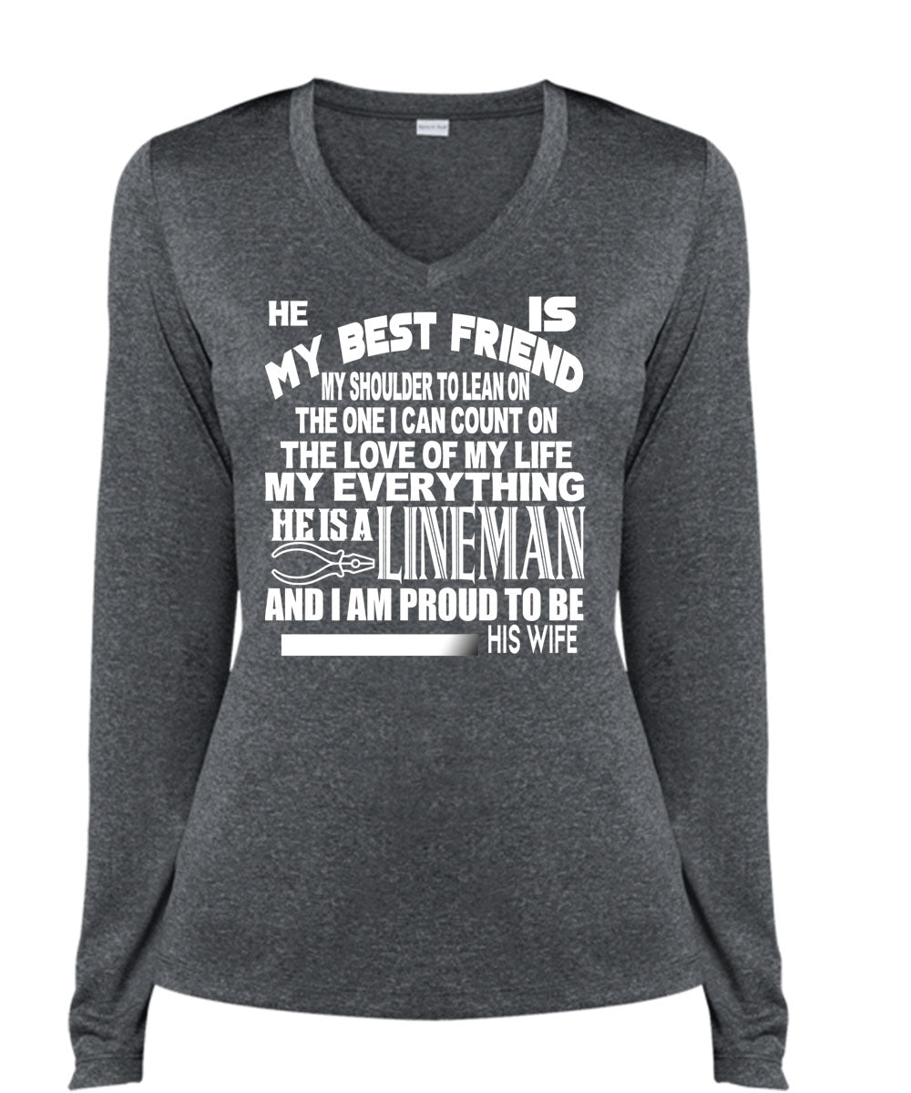 He Is My Best Friend He Is A Lineman T Shirt, I Am Proud To Be His Wife T Shirt, Cool Shirt (Ladies LS Heather V-Neck)