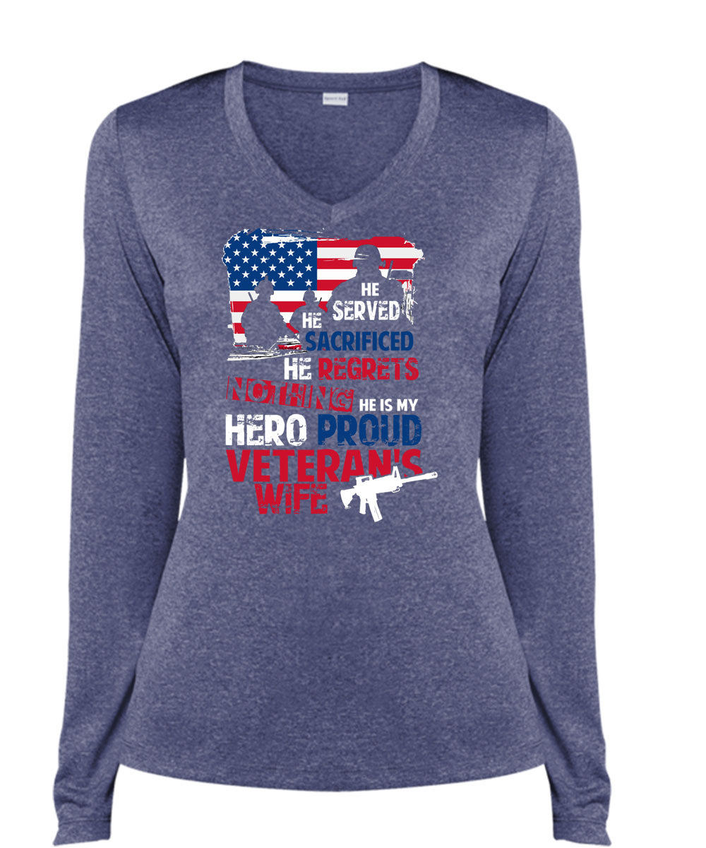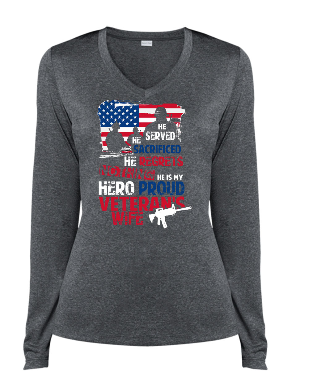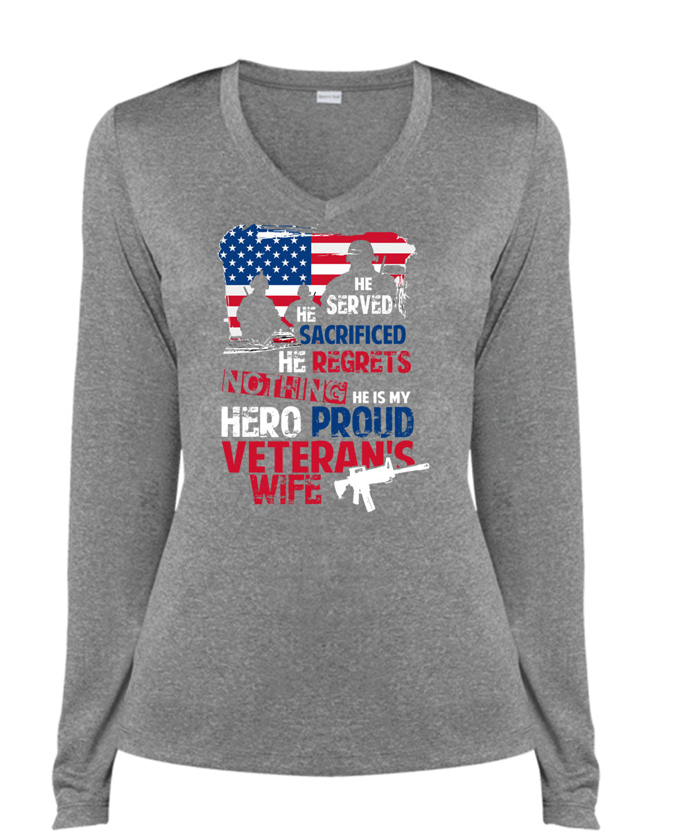 He Is Proud Veteran's Wife T Shirt, He Served He Sacrificed T Shirt, Cool Shirt (Ladies LS Heather V-Neck)
