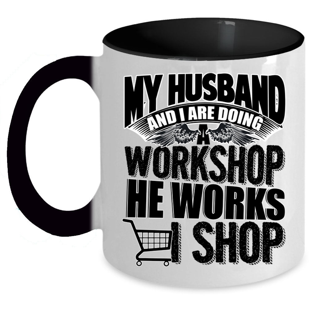 He Works I Shop Coffee Mug, My Husband And I Are Doing A Workshop Accent Mug
