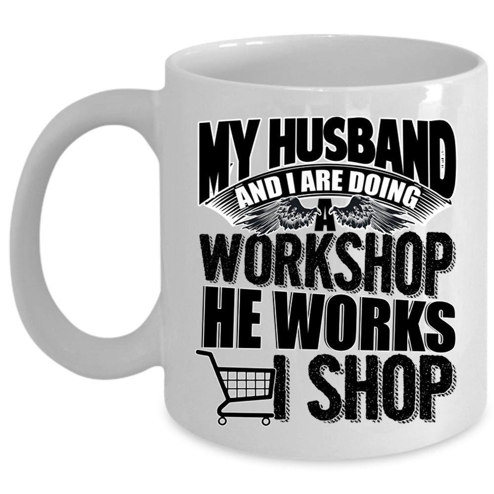 He Works I Shop Coffee Mug, My Husband And I Are Doing A Workshop Cup