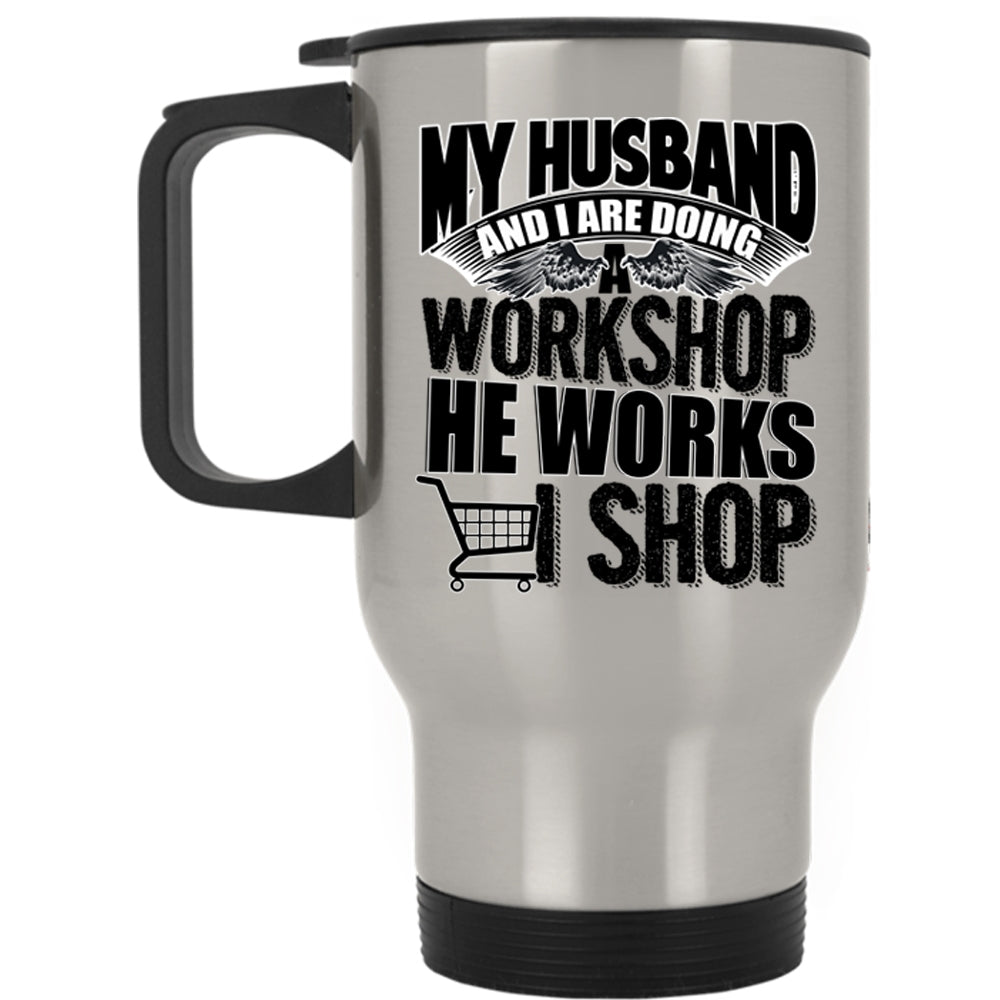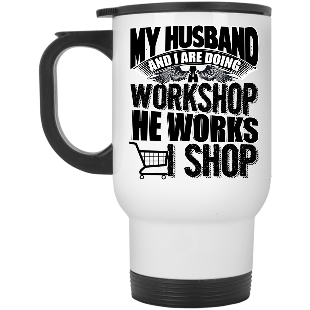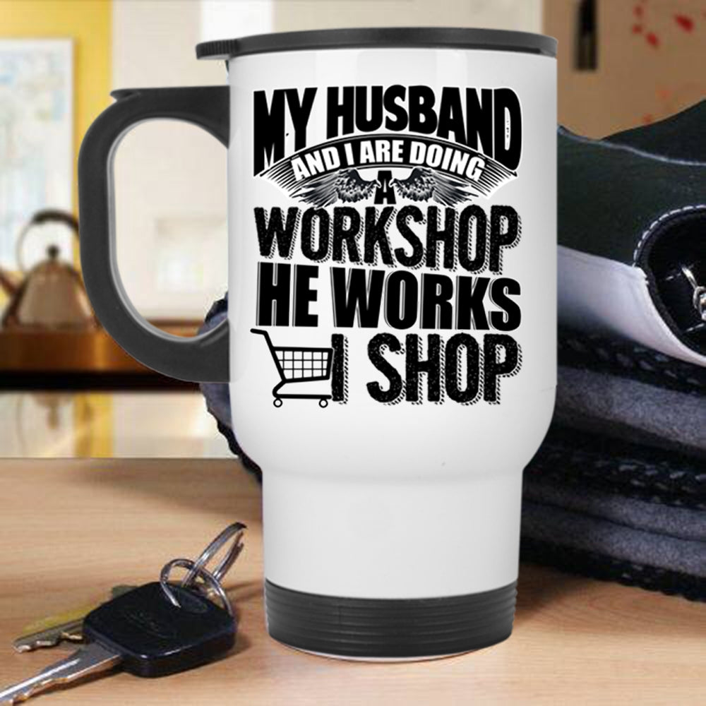 He Works I Shop Travel Mug, My Husband And I Are Doing A Workshop Mug