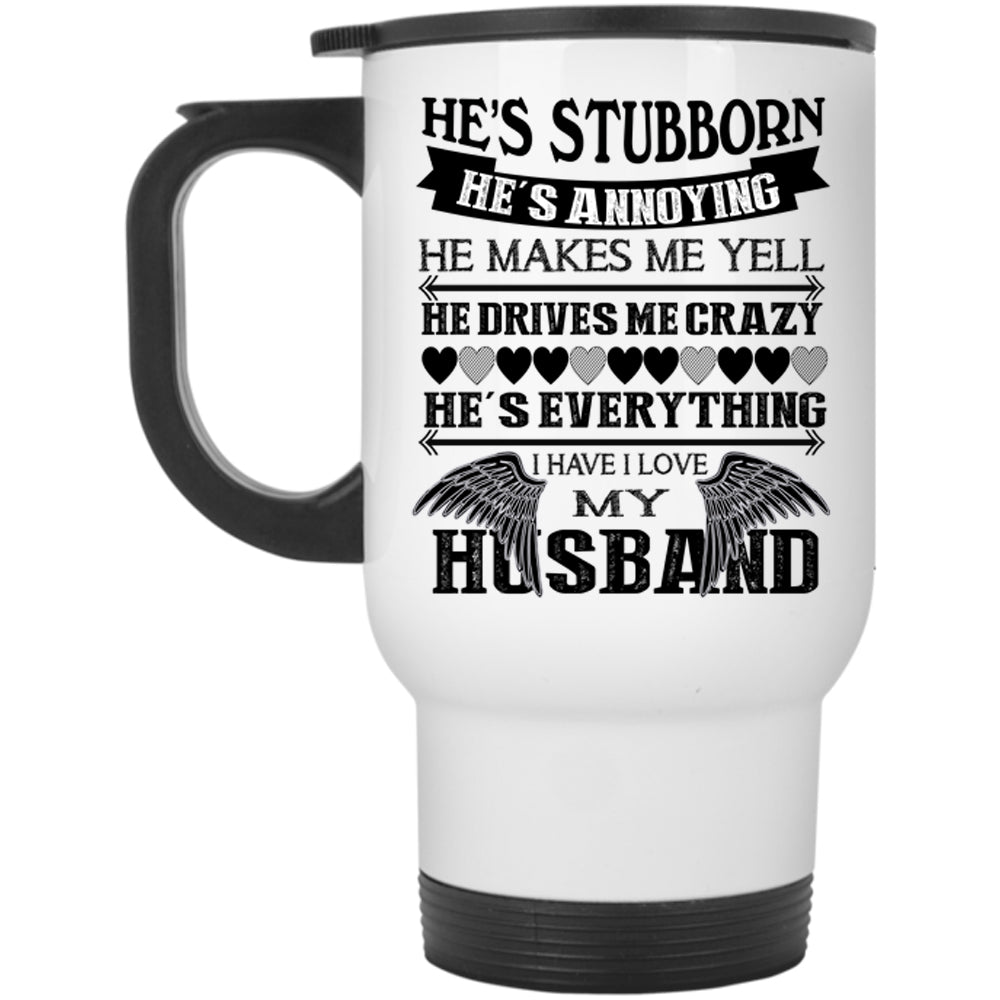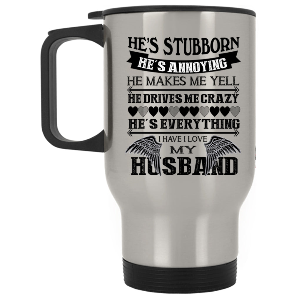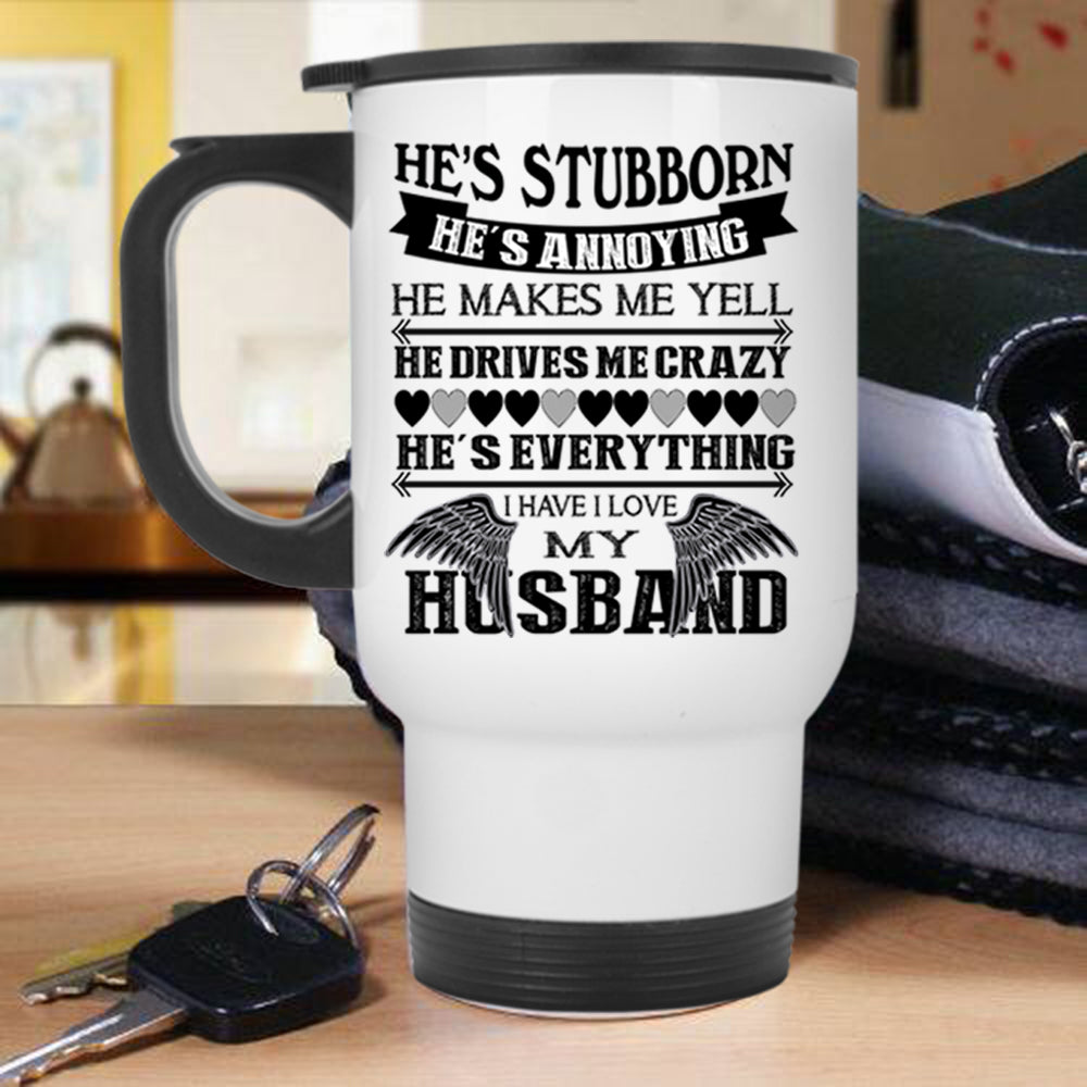 He's Stubborn Travel Mug, I Love My Husband Mug