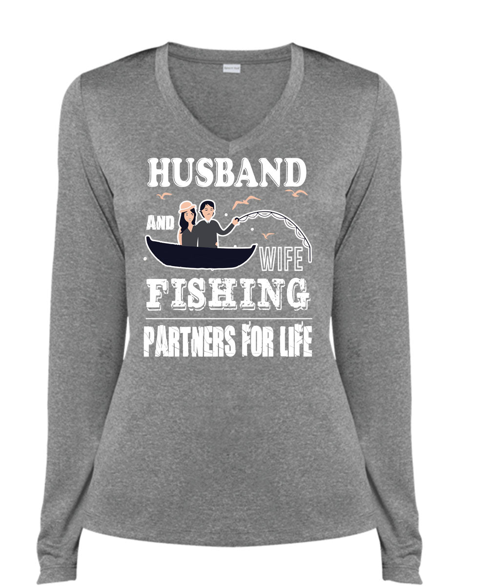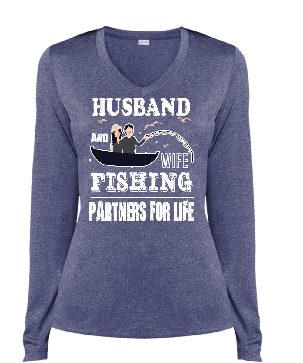 Husband And Wife Fishing Partners For Life T Shirt, I Love Fisherman T Shirt, Cool Shirt (Ladies LS Heather V-Neck)