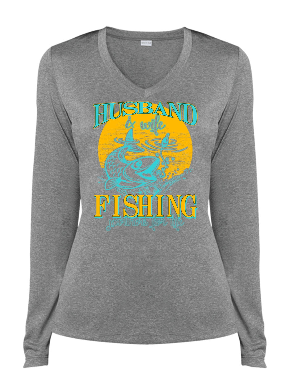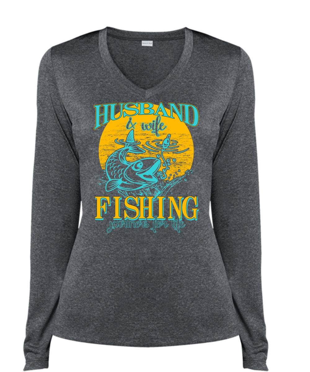 Husband And Wife Fishing Partners For Life T Shirt, I Love Fishing T Shirt, Cool Shirt (Ladies LS Heather V-Neck)