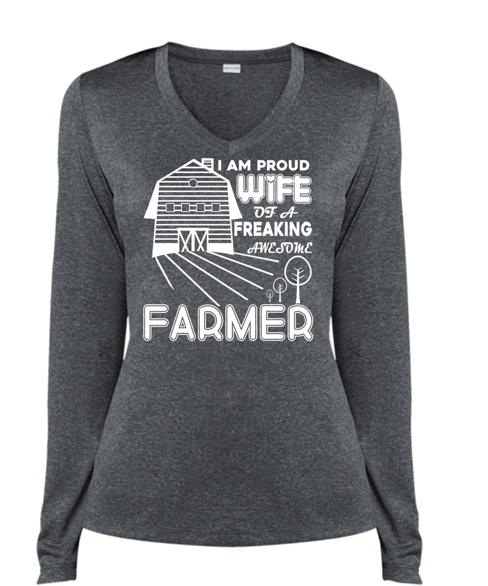 I Am Proud Wife Of A Freaking Awesome Farmer T Shirt, Being A Farmer T Shirt, Cool Shirt (Ladies LS Heather V-Neck)