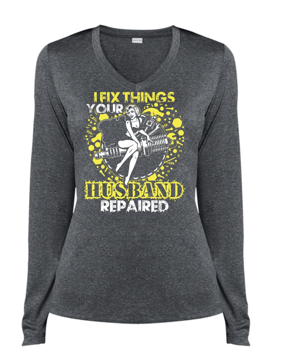 I Fix Things Husband Repaired T Shirt, Being A Mechanic T Shirt, Cool Shirt (Ladies LS Heather V-Neck)