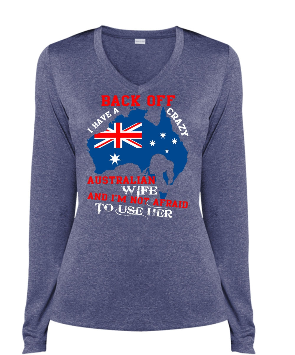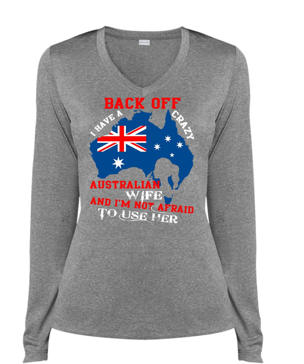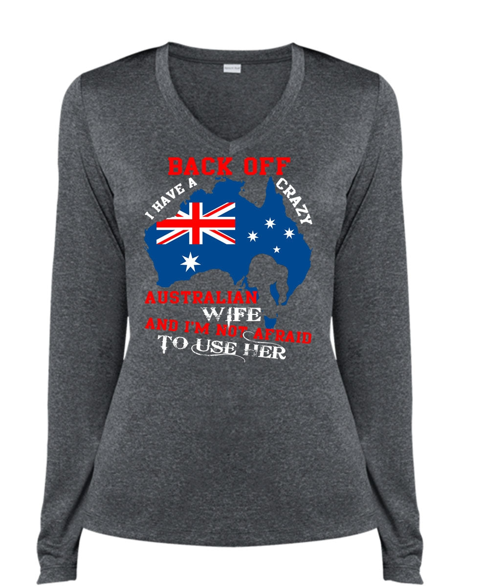 I Have A Crazy Australian Wife T Shirt, I'm Not Afraid To Use Her T Shirt, Cool Shirt (Ladies LS Heather V-Neck)