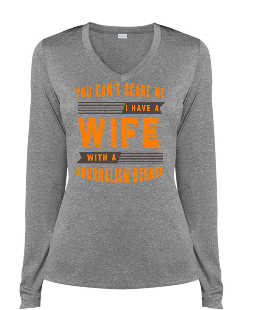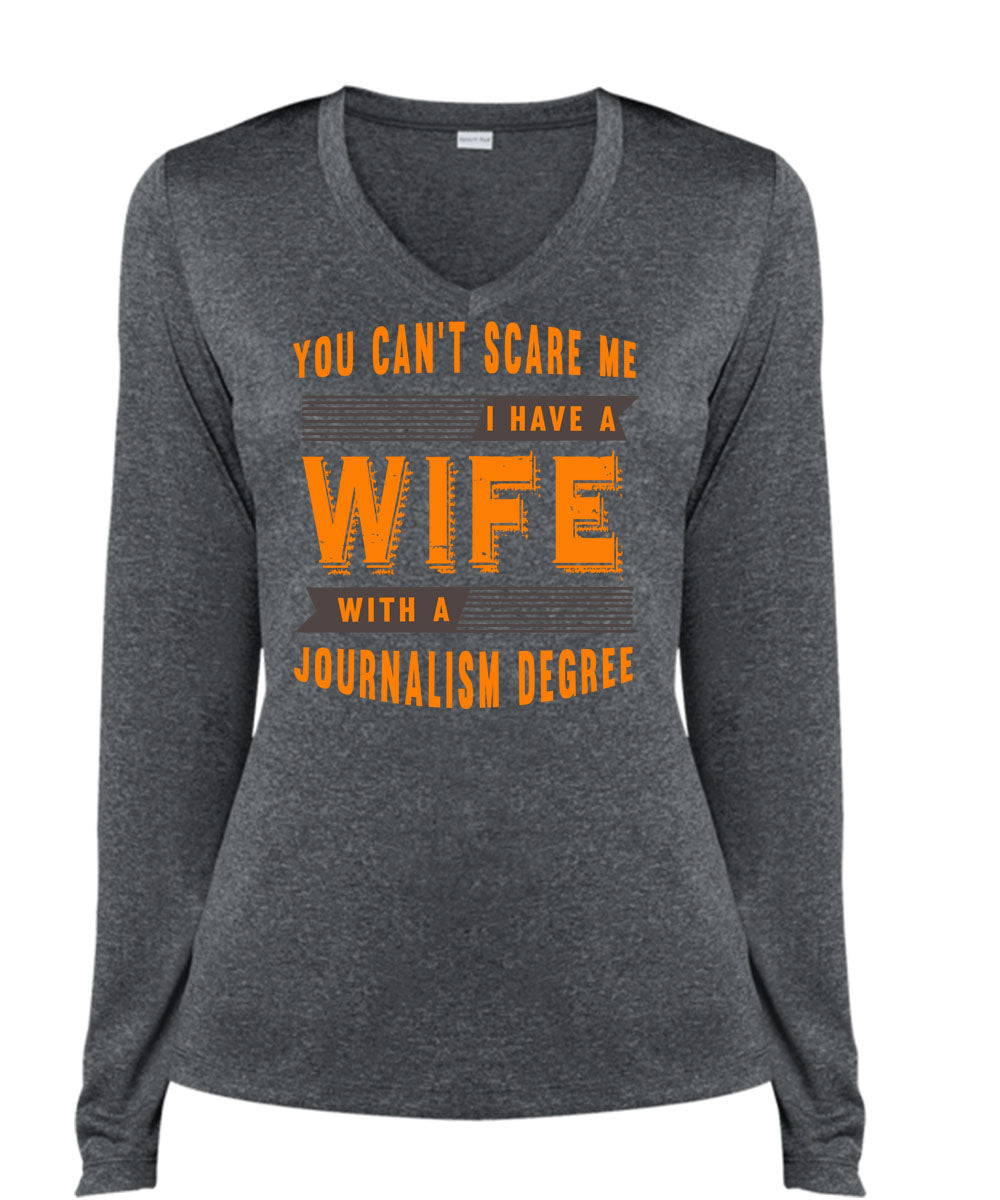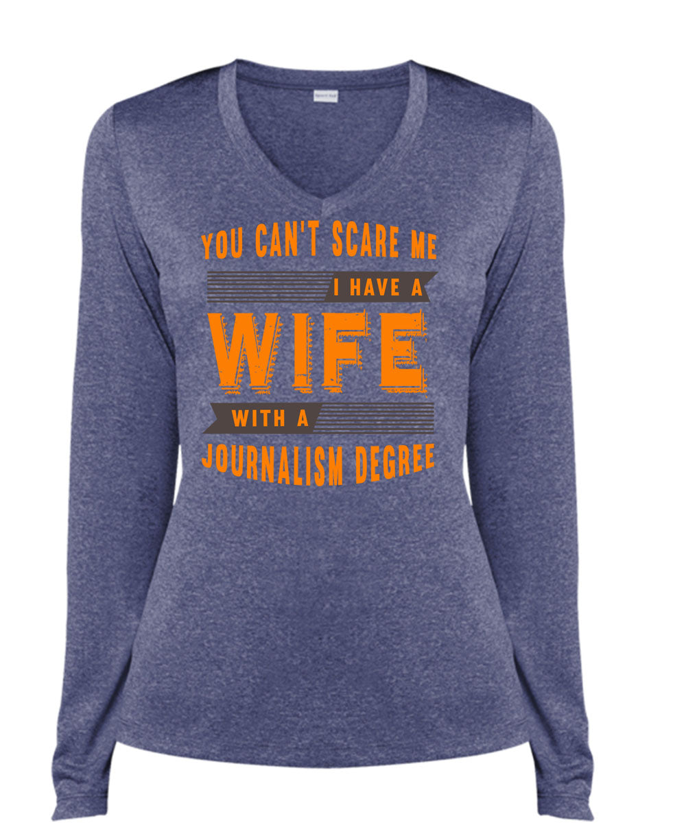 I Have A Wife With A Journalism Degree T Shirt, You Can't Scare Me T Shirt, Cool Shirt (Ladies LS Heather V-Neck)