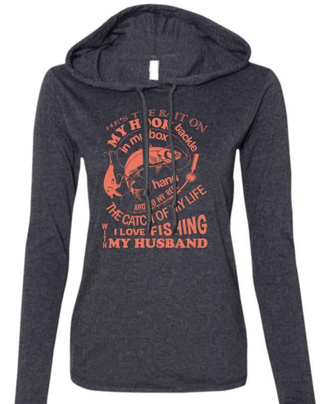 I Love Fishing With My Husband T Shirt, He's The Bait On My Hook T Shirt (Anvil Ladies Ringspun Hooded)