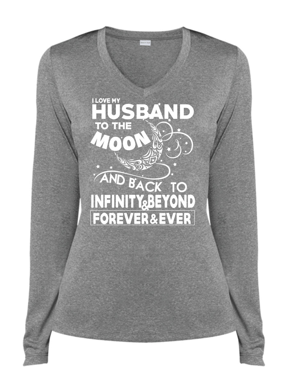 I Love My Husband To The Moon T Shirt, Back To Infinity And Beyond T Shirt, Cool Shirt (Ladies LS Heather V-Neck)