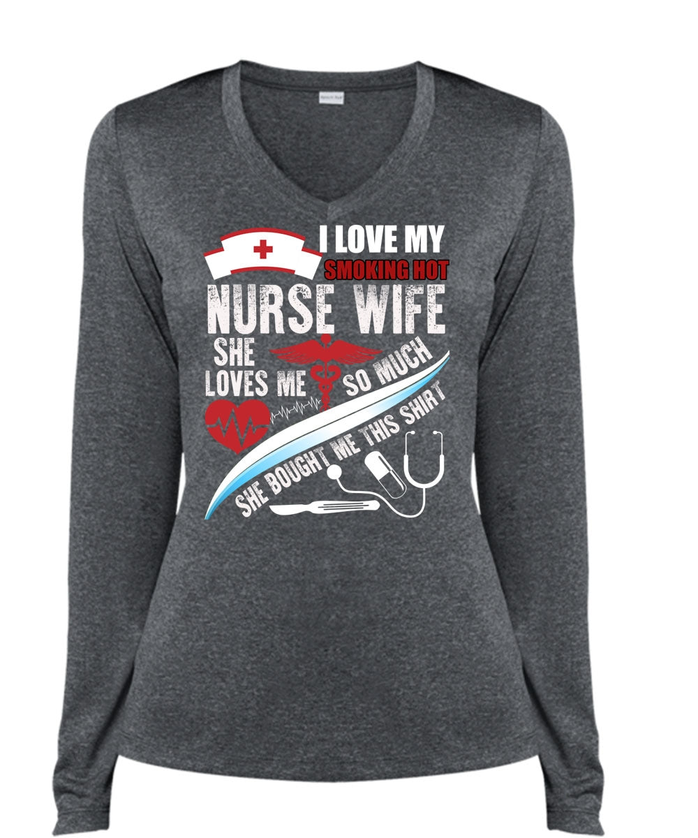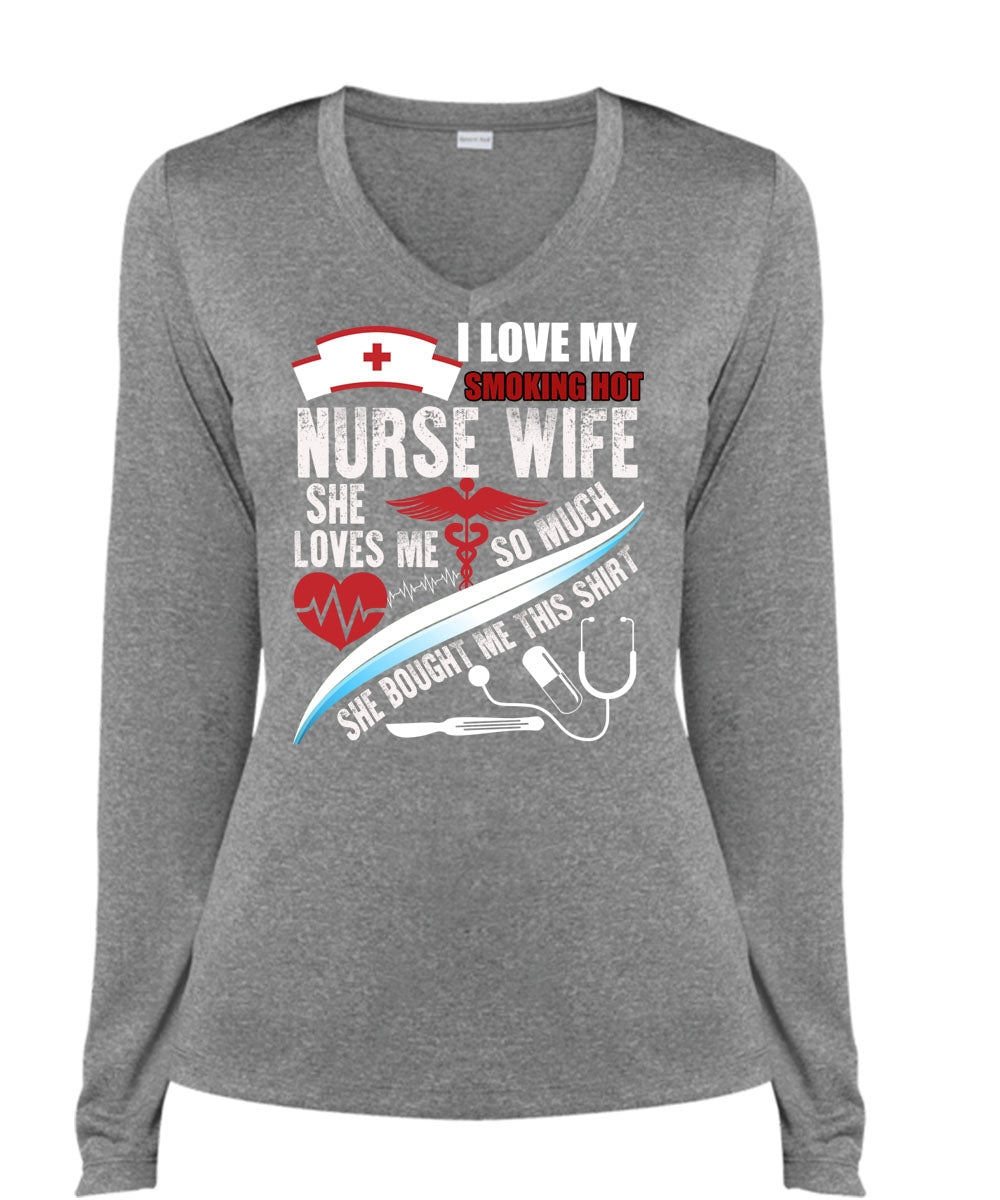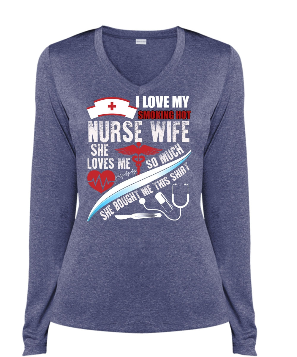 I Love My Smoking Hot Nurse Wife T Shirt, Being A Nurse T Shirt, Cool Shirt (Ladies LS Heather V-Neck)