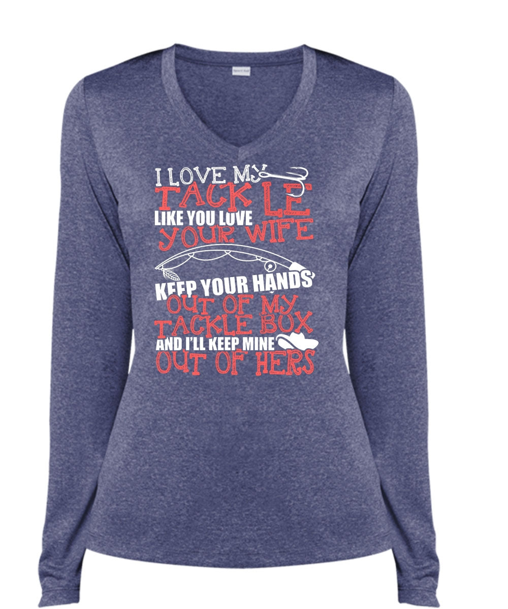 I Love My Tackle Like You Love Your Wife T Shirt, Being A Fisher T Shirt, Cool Shirt (Ladies LS Heather V-Neck)