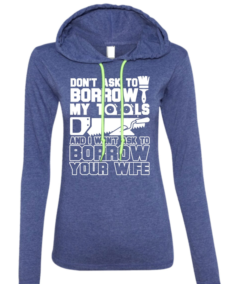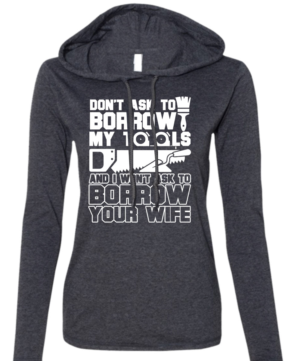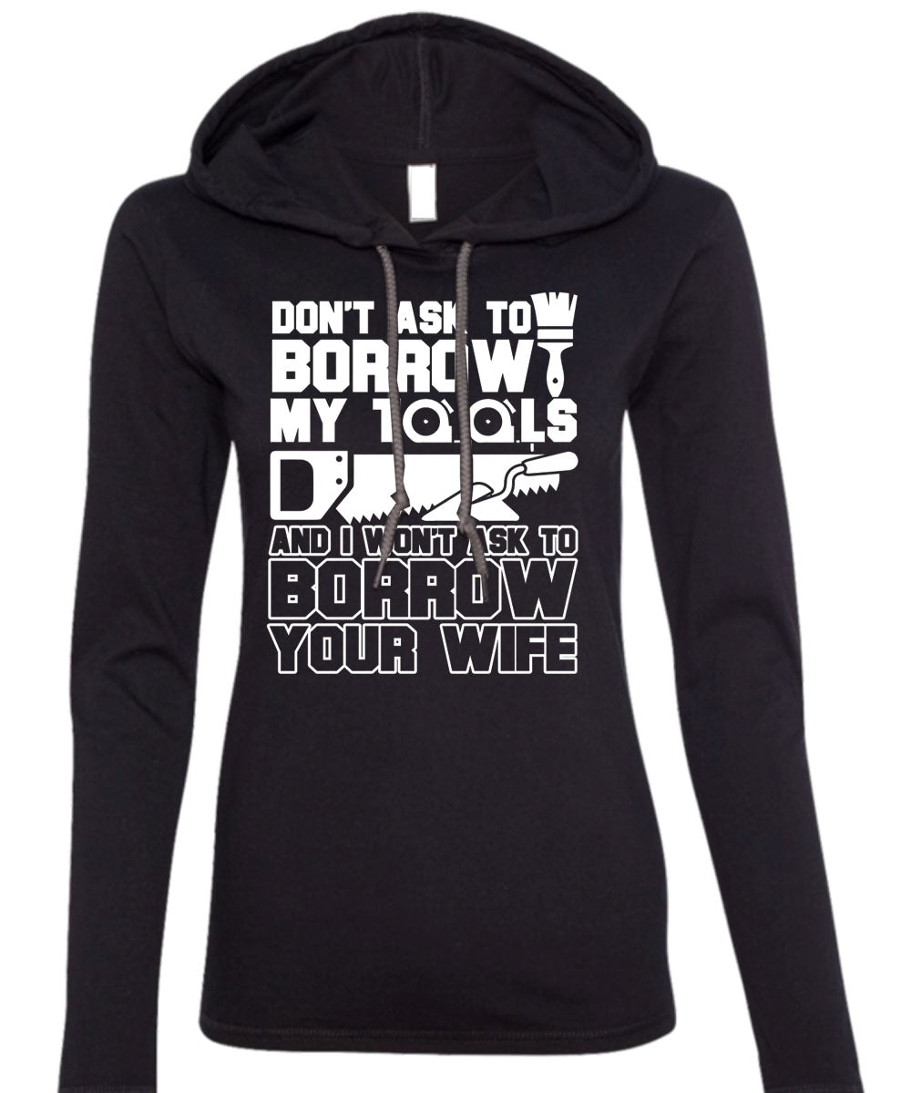 I Won't Ask To Borrow Your Wife T Shirt, Being A Husband T Shirt (Anvil Ladies Ringspun Hooded)