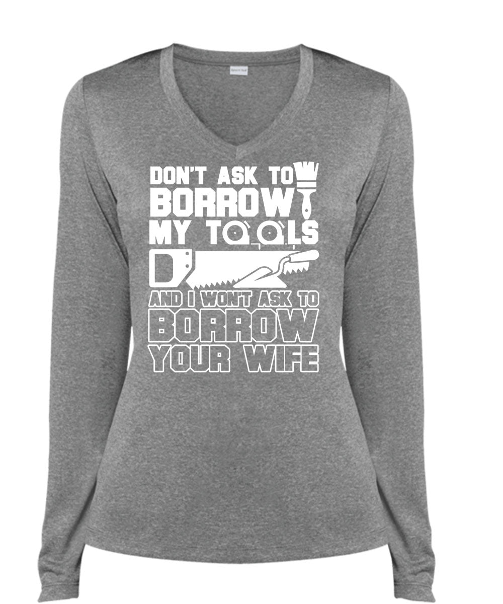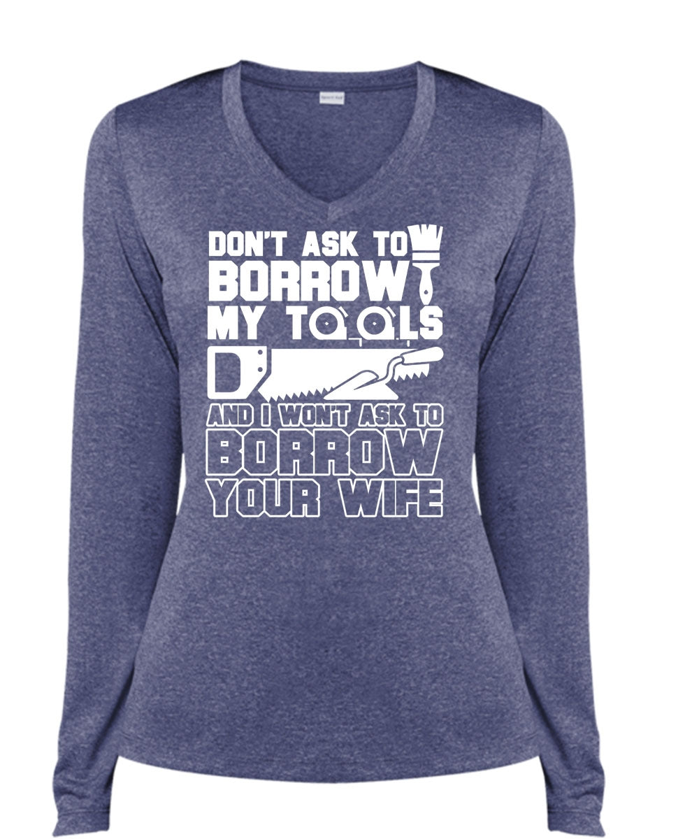 I Won't Ask To Borrow Your Wife T Shirt, Being A Husband T Shirt, Cool Shirt (Ladies LS Heather V-Neck)
