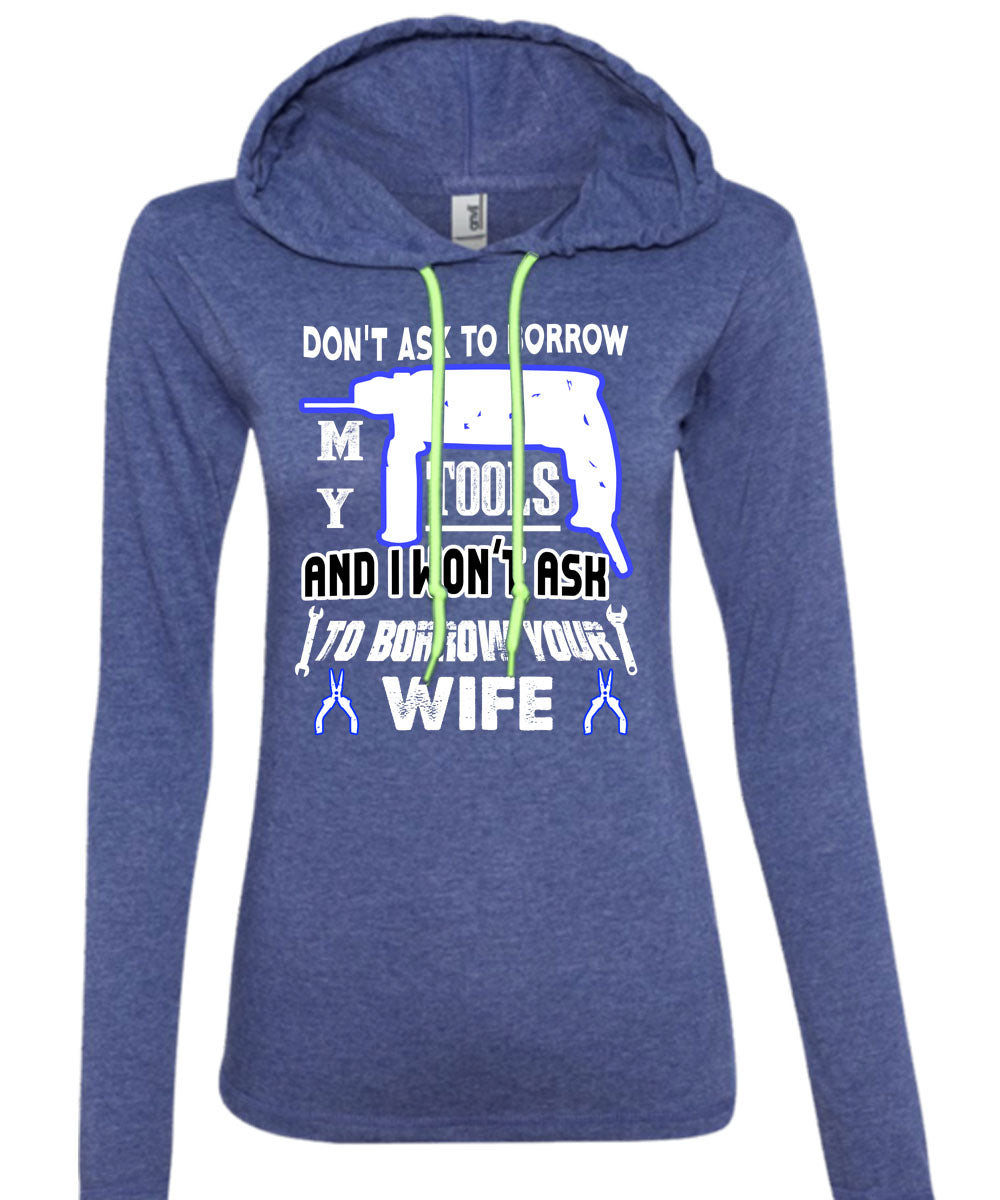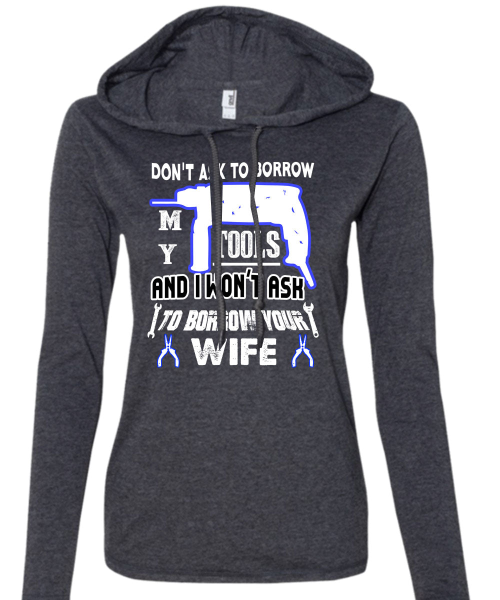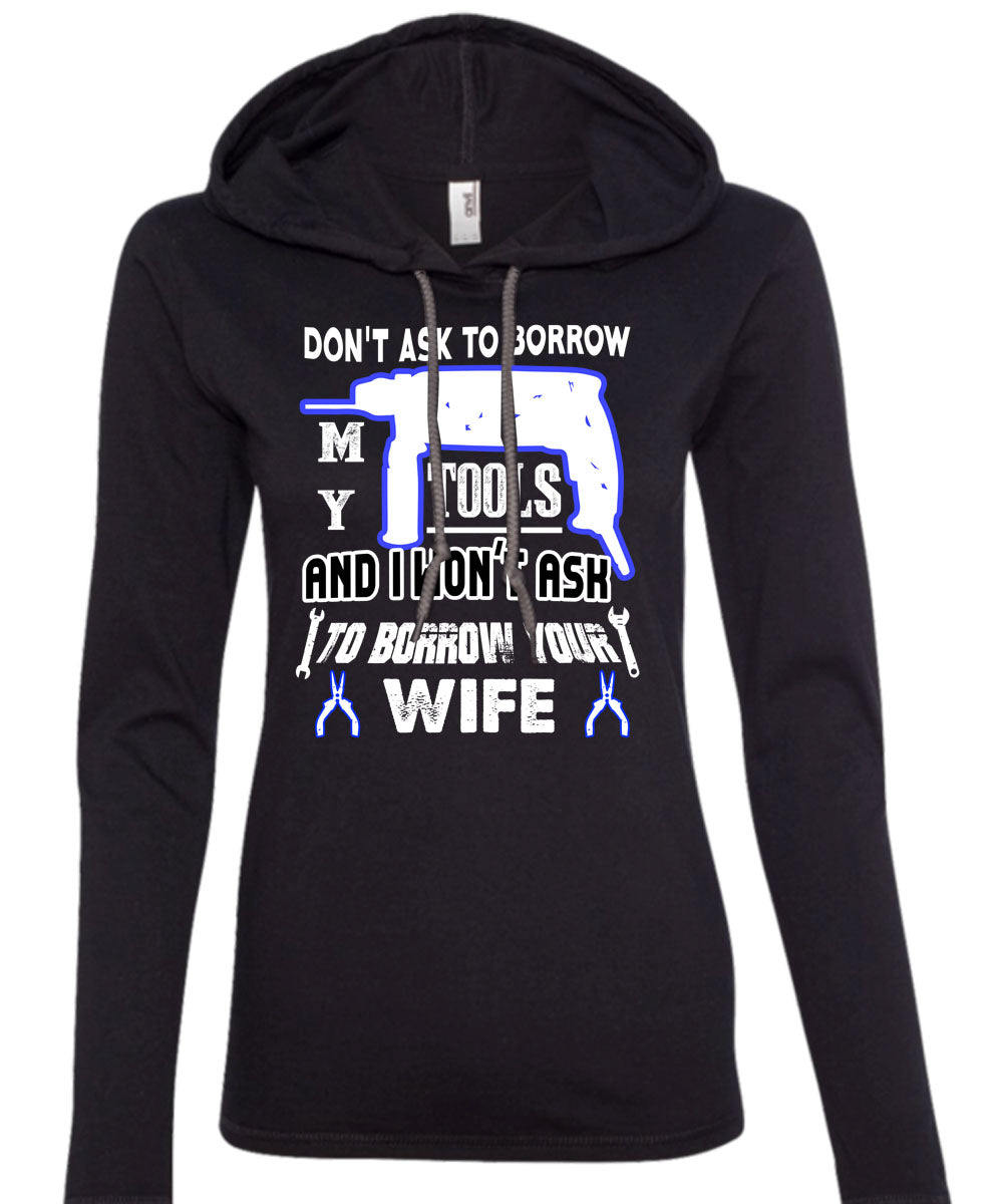 I Won't Ask To Borrow Your Wife T Shirt, Don't Ask To Borrow My Tools T Shirt (Anvil Ladies Ringspun Hooded)