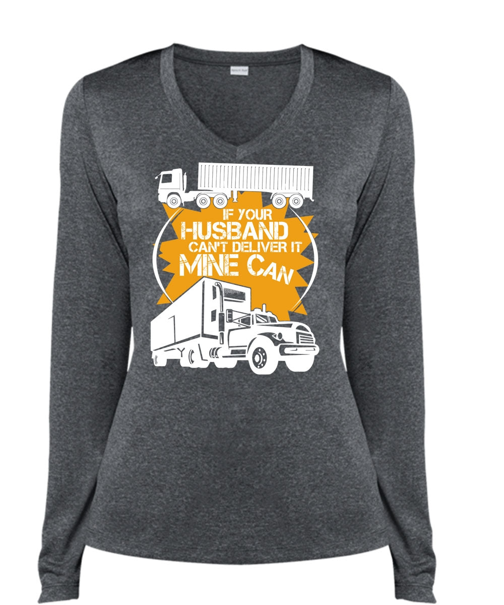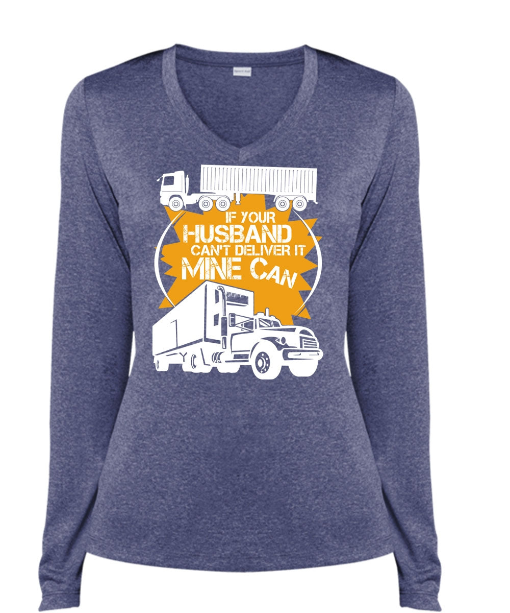 If Your Husband Can't Deliver It Mine Can T Shirt, Being A Trucker T Shirt, Cool Shirt (Ladies LS Heather V-Neck)