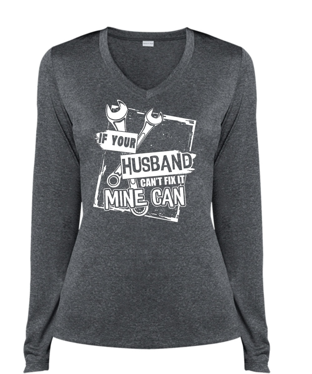 If Your Husband Can't Fix It Mine Can T Shirt, Being A Mechanic T Shirt, Cool Shirt (Ladies LS Heather V-Neck)