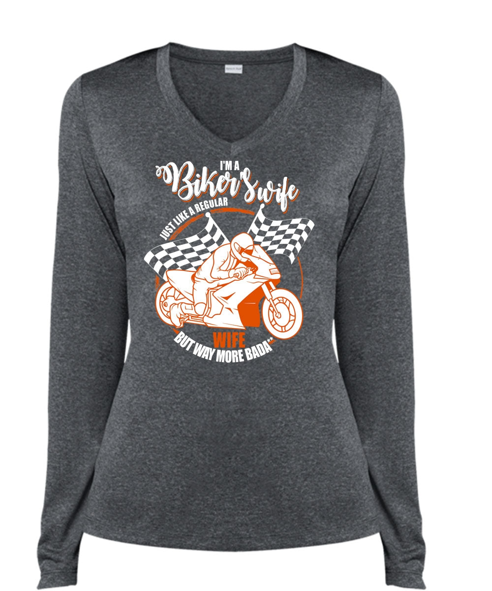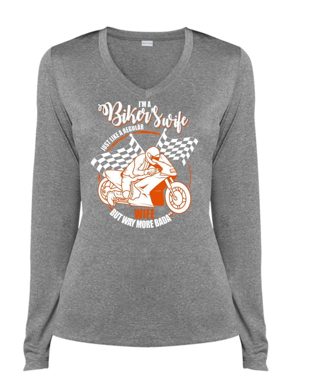 I'm A Biker's Wife T Shirt, Being A Biker T Shirt, Cool Shirt (Ladies LS Heather V-Neck)