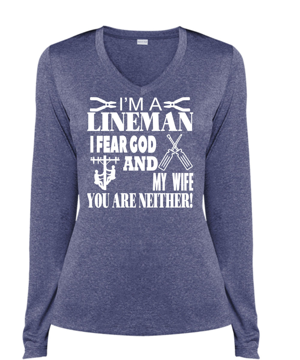 I'm A Lineman T Shirt, I Fear God And My Wife T Shirt, Cool Shirt (Ladies LS Heather V-Neck)