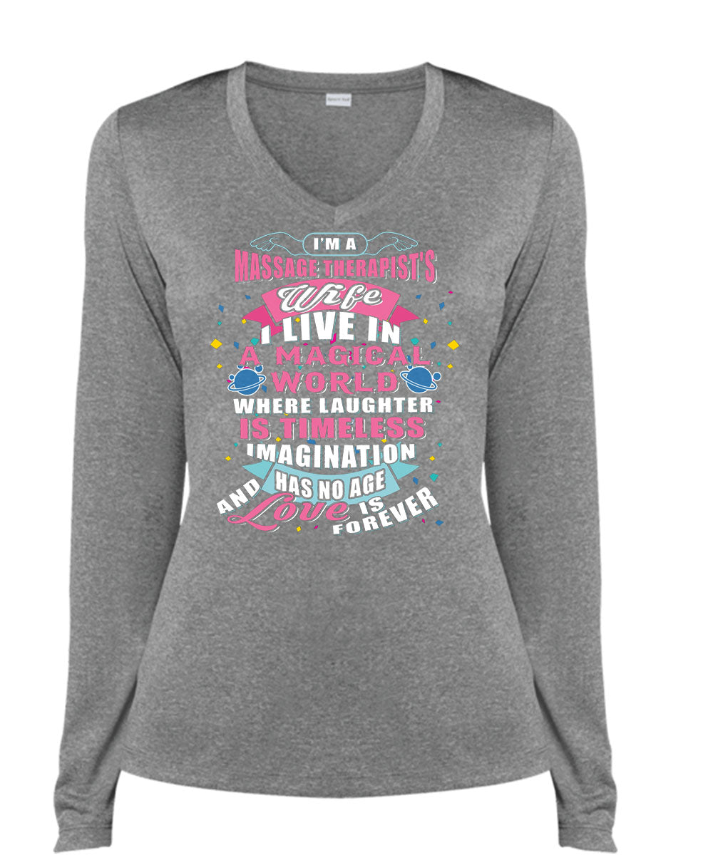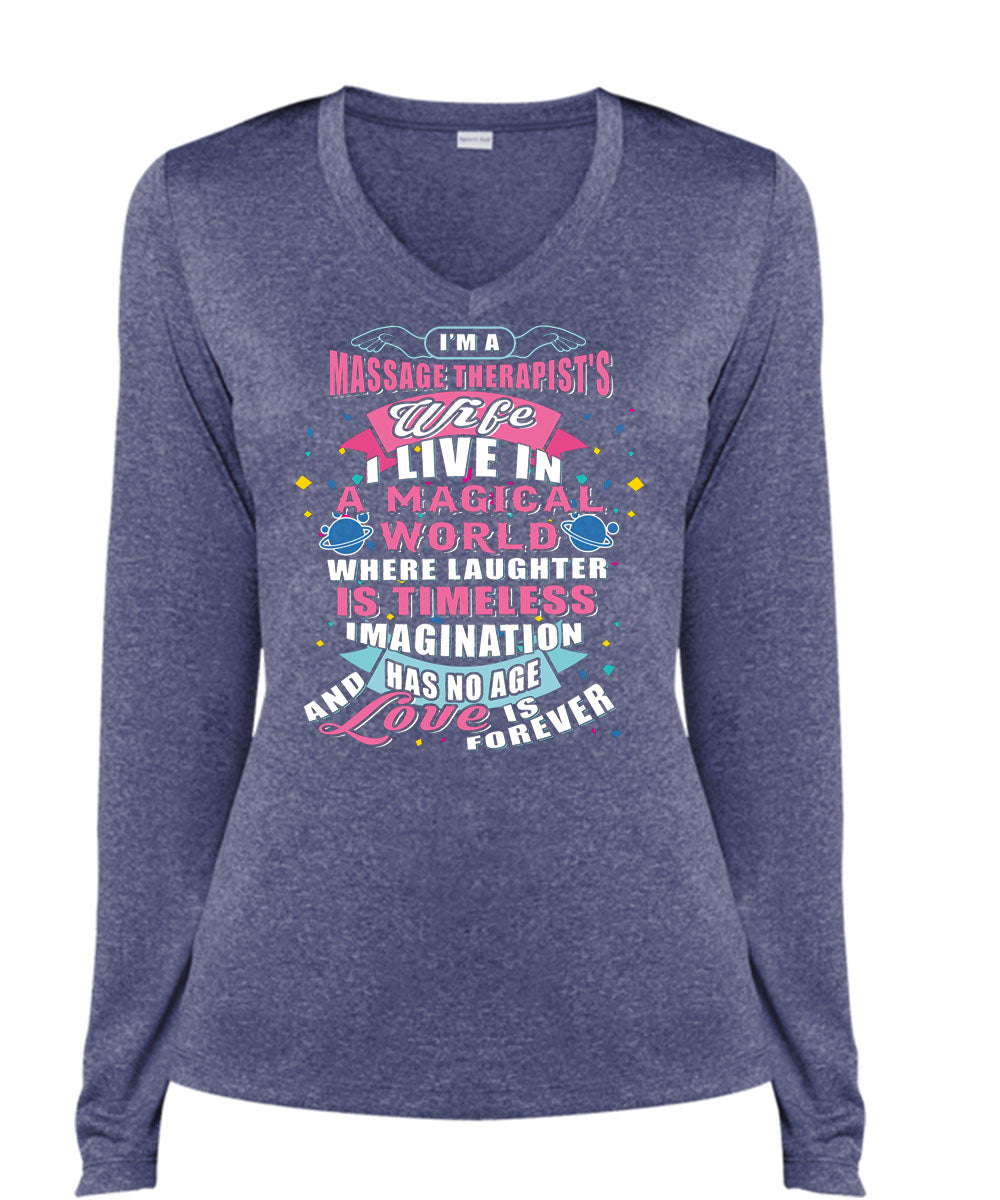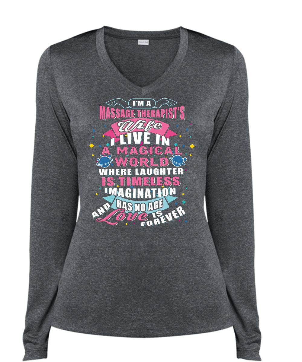 I'm A Massage Therapist's Wife T Shirt, I Live In A Magical World T Shirt, Cool Shirt (Ladies LS Heather V-Neck)