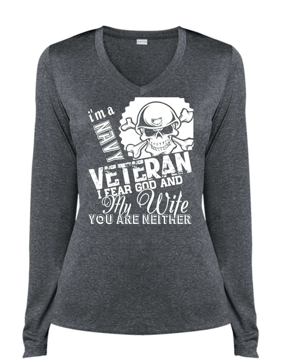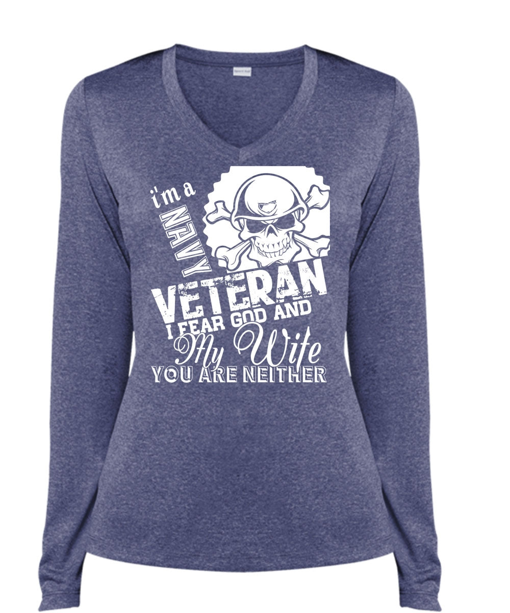 I'm A Navy Veteran T Shirt, I Fear God And My Wife Shirt (Ladies LS Heather V-Neck)