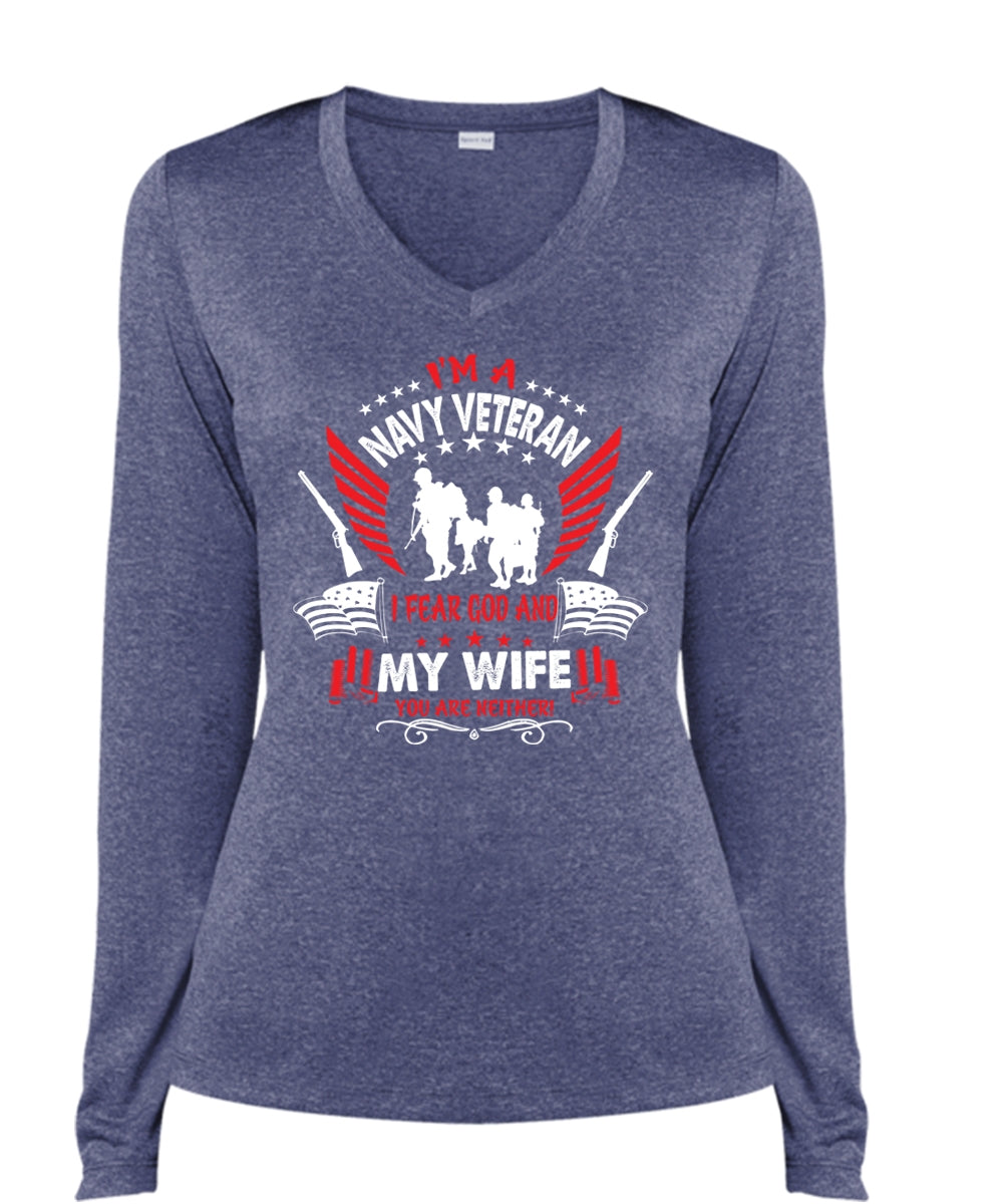 I'm A Navy Veteran T Shirt, I Fear God And My Wife T Shirt (Ladies LS Heather V-Neck)