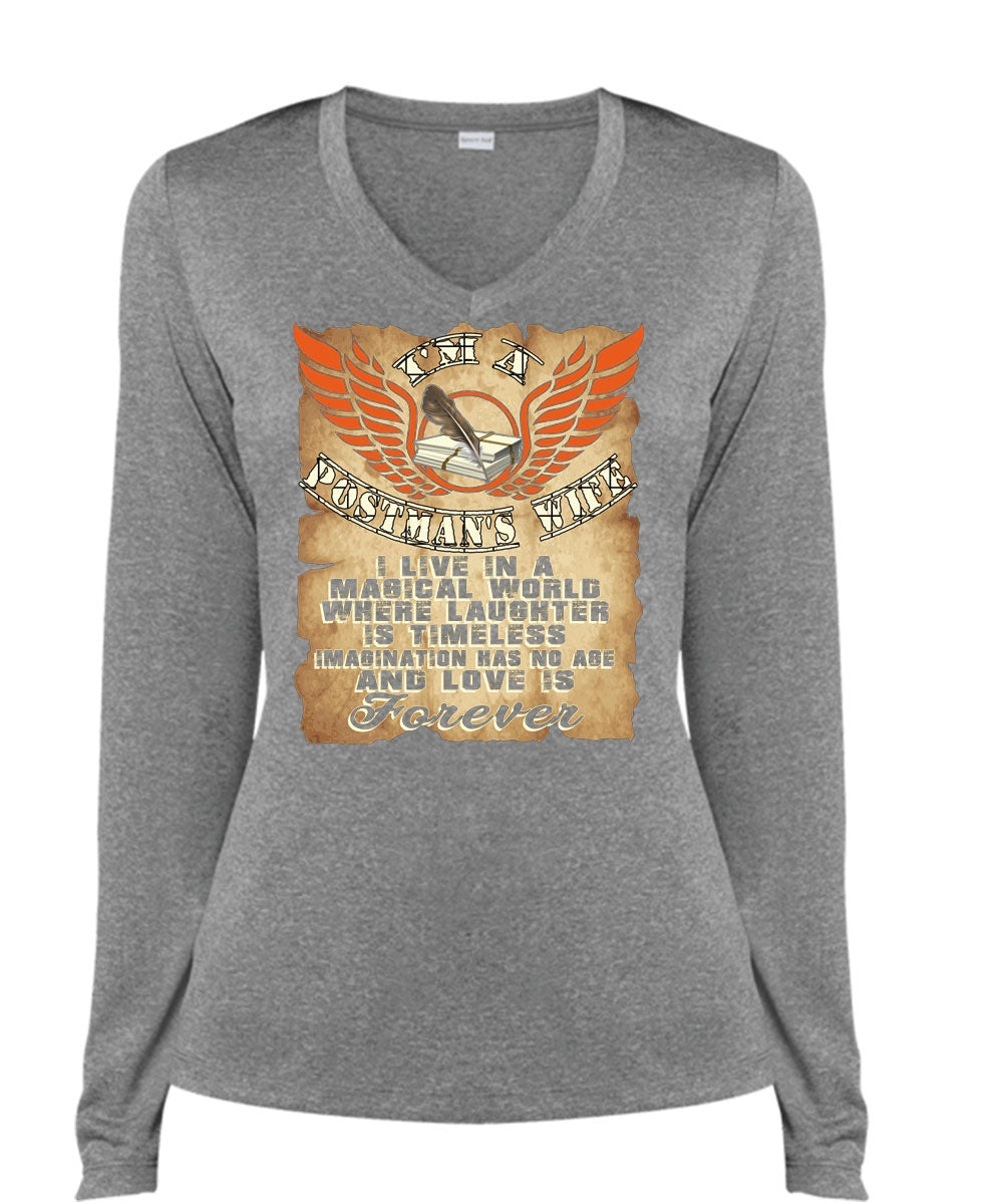 I'm A Postman's Wife T Shirt, I Live In A Magical World T Shirt, Cool Shirt (Ladies LS Heather V-Neck)