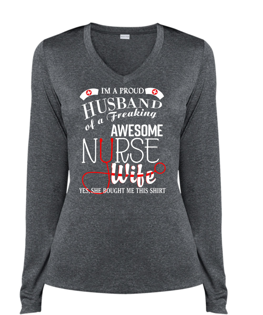 I'm A Proud Husband Of A Freaking Awesome Nurse Wife T Shirt, I Love Nurse T Shirt, Cool Shirt (Ladies LS Heather V-Neck)
