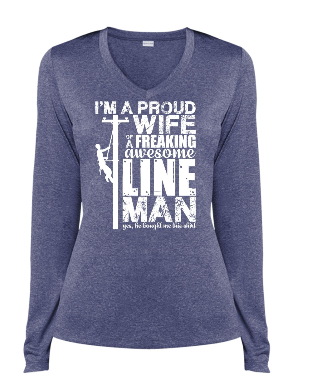 I'm A Proud Wife T Shirt, Awesome Lineman T Shirt, Cool Shirt (Ladies LS Heather V-Neck)