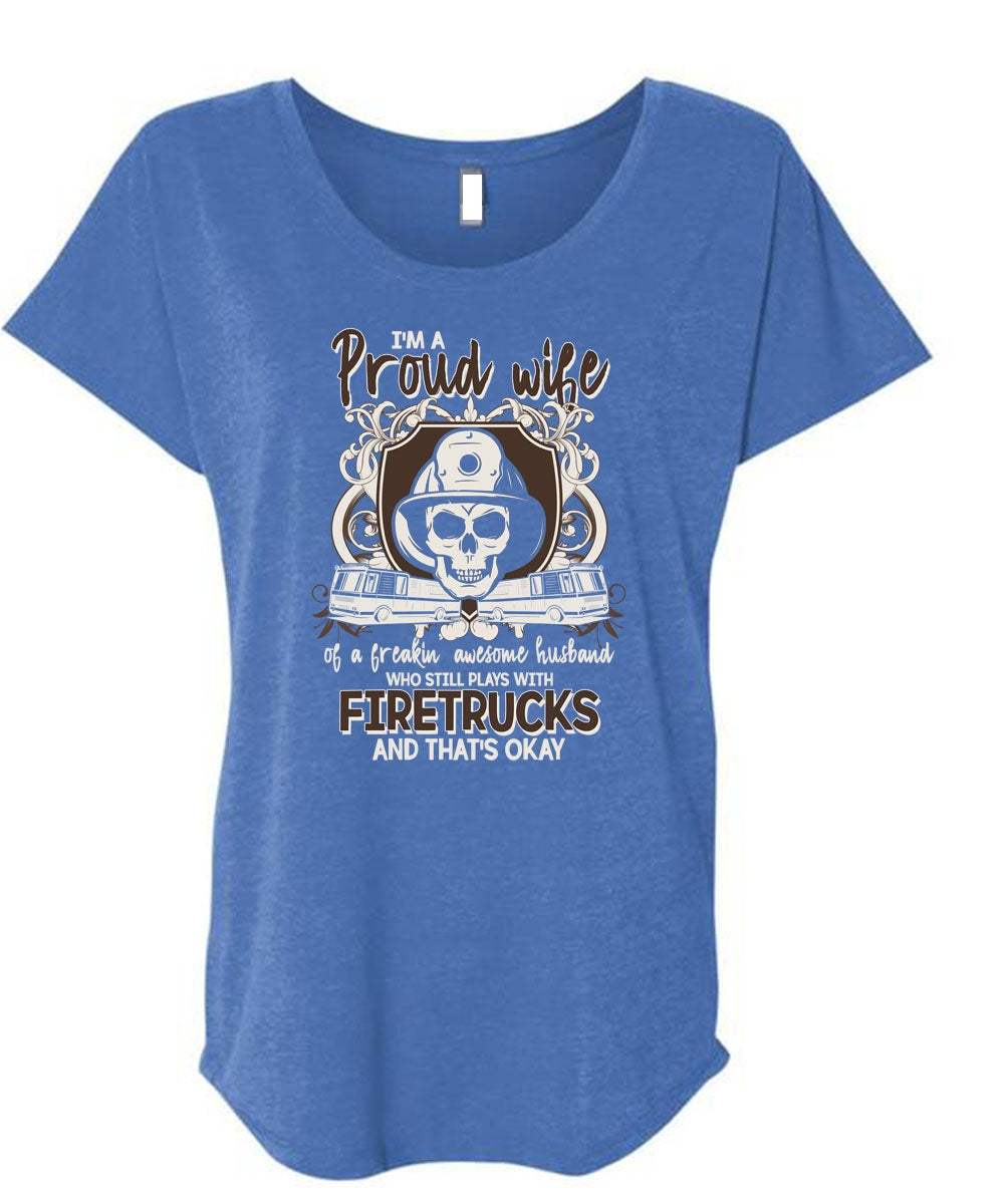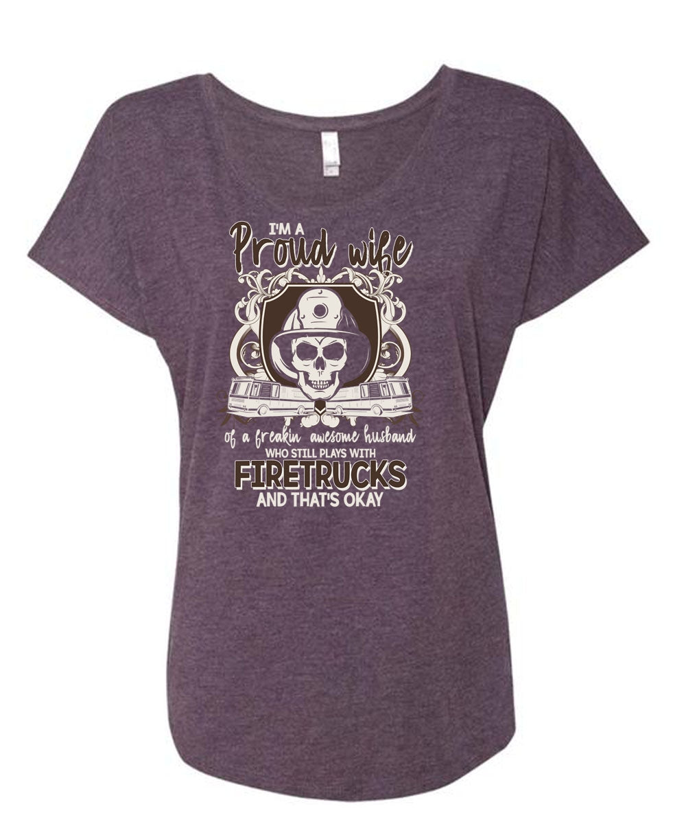 I'm A Proud Wife T Shirt, Still Plays With Fire Trucks T Shirt, Cool Shirt (Ladies' Triblend Dolman Sleeve)
