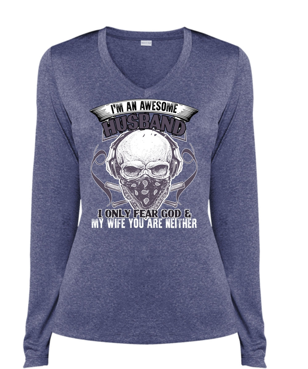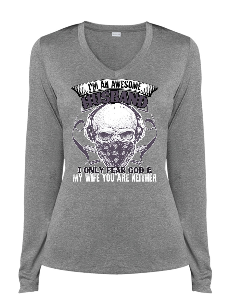 I'm An Awesome Husband T Shirt, Fear God And My Wife T Shirt, Cool Shirt (Ladies LS Heather V-Neck)