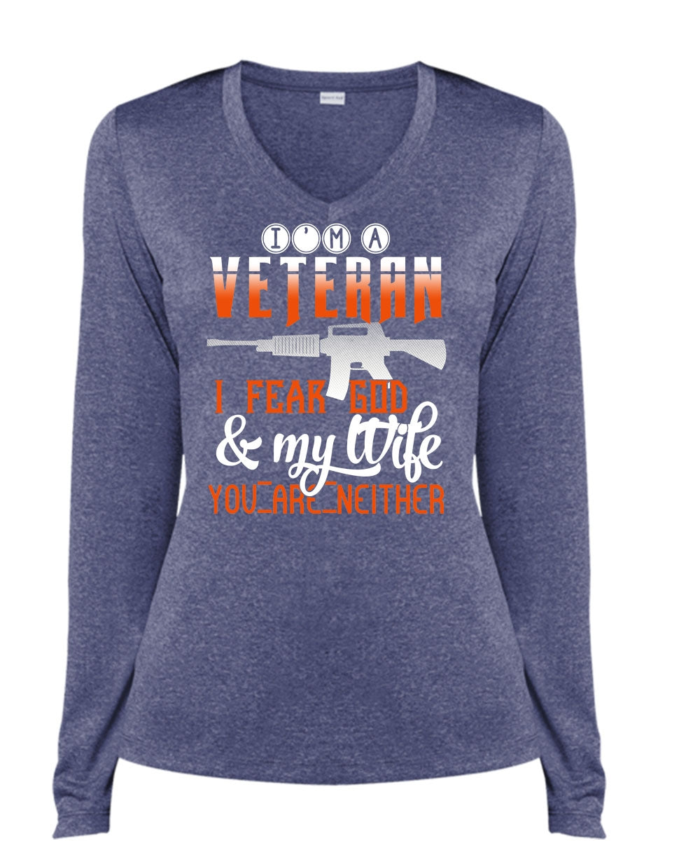 I'm An Veteran I Fear God And My Wife You Are Neither T Shirt, Love T Shirt (Ladies LS Heather V-Neck)