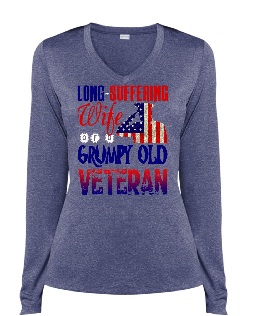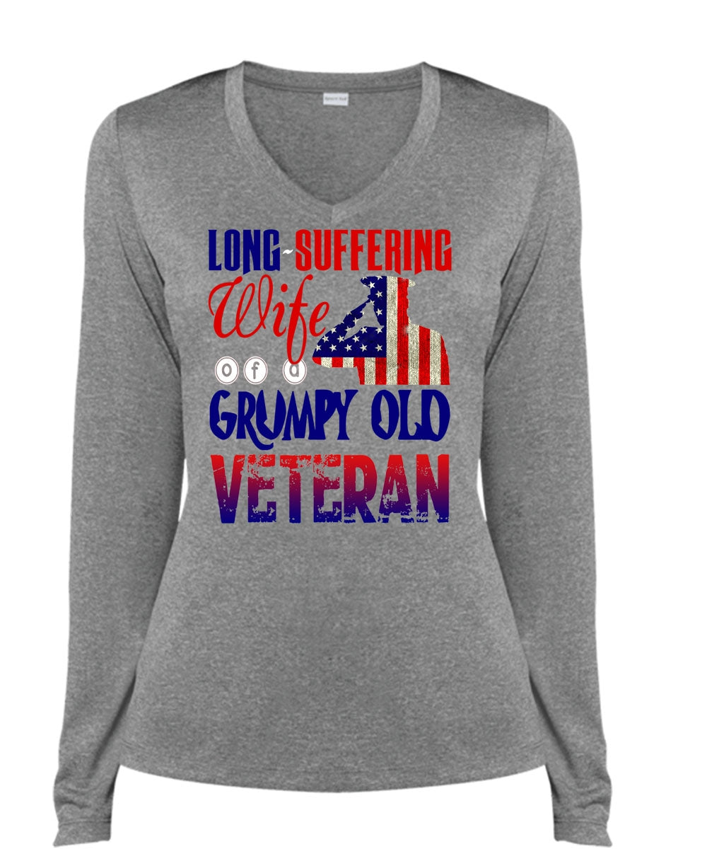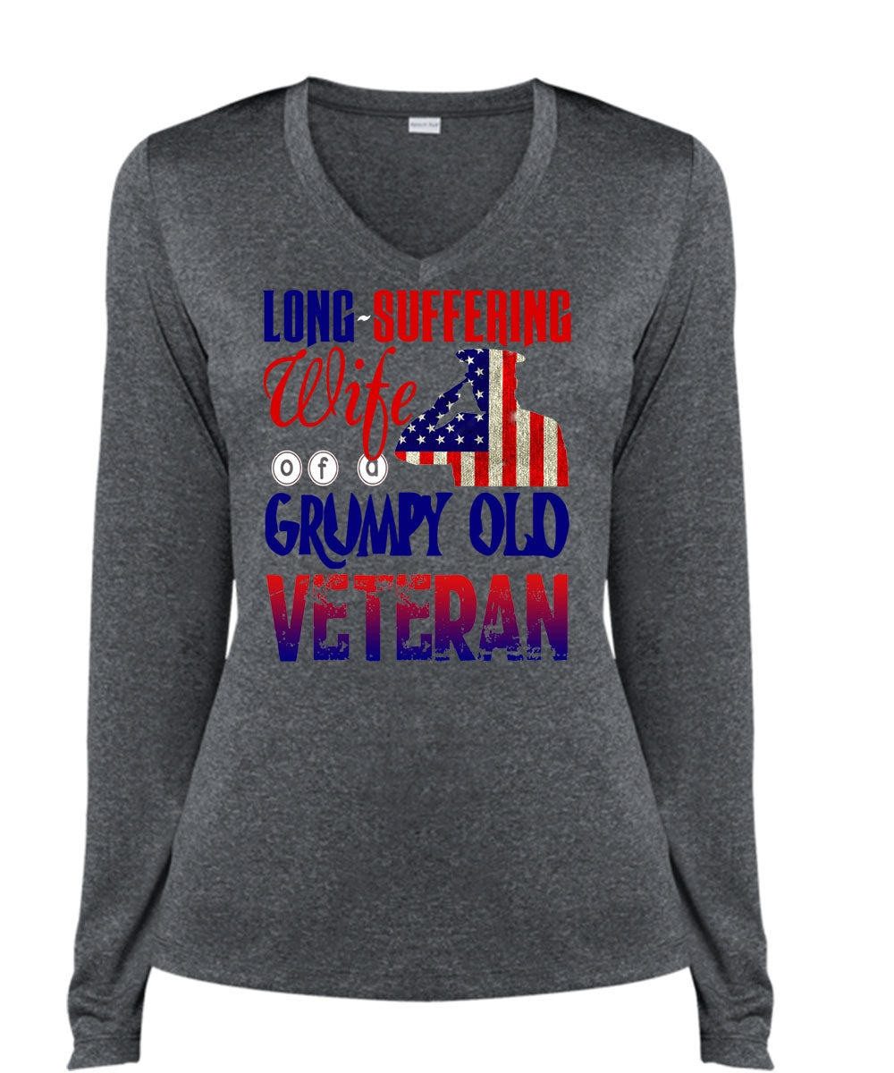 Long Suffering Wife Of A Grumpy Old Veteran T Shirt, My Life Shirt (Ladies LS Heather V-Neck)