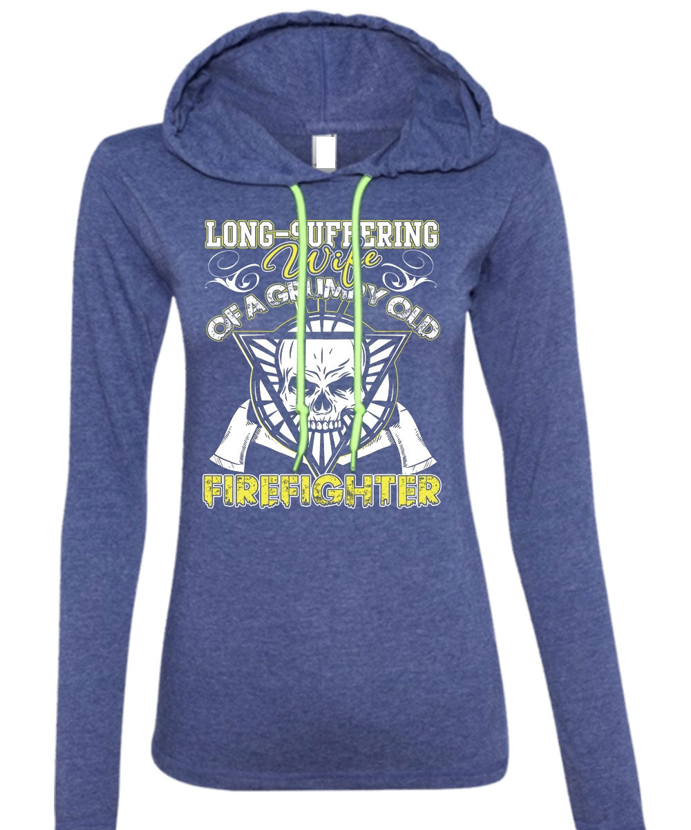 Long - Suffering Wife T Shirt, Grumpy Old Firefighter T Shirt (Anvil Ladies Ringspun Hooded)