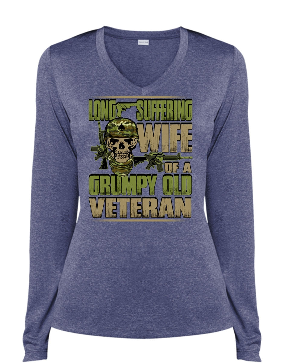 Long Suffering Wife T Shirt, Grumpy Old Veteran T Shirt, Cool Shirt (Ladies LS Heather V-Neck)