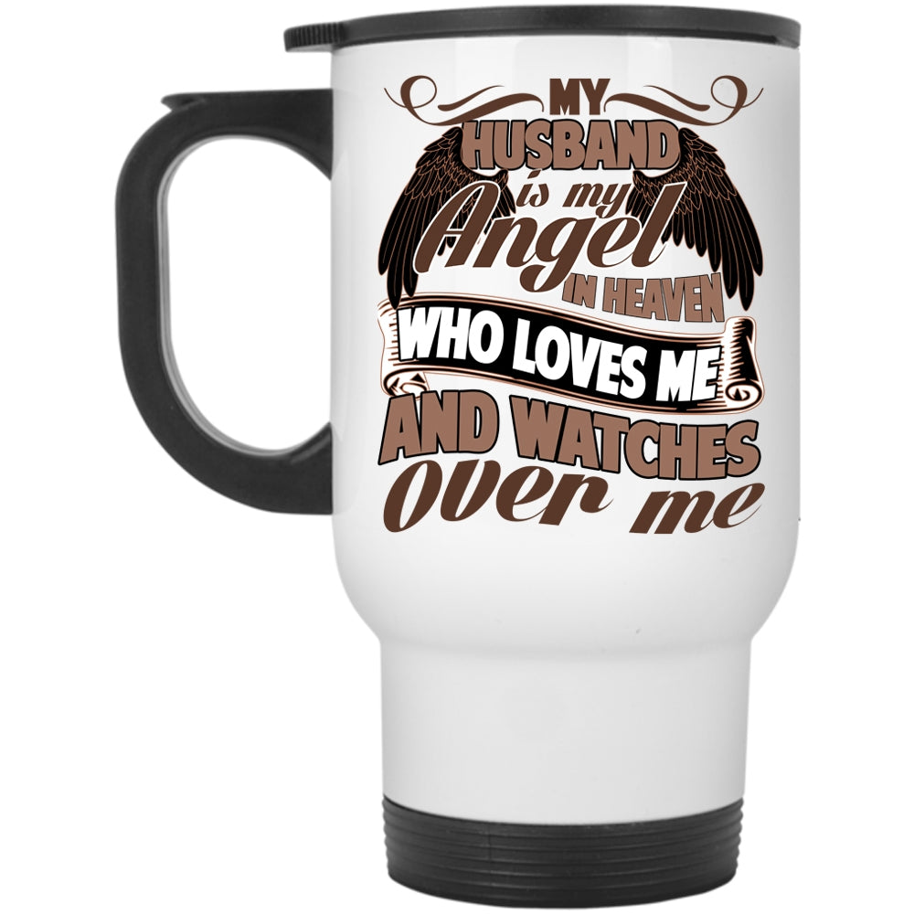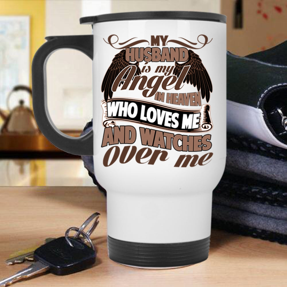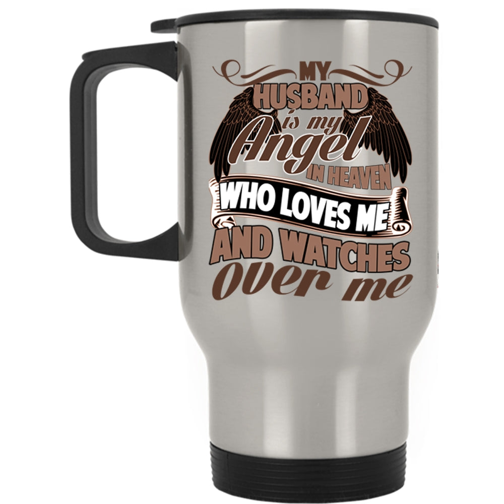 Loves Me And Watches Over Me Travel Mug, My Husband Is My Angel In Heaven Mug