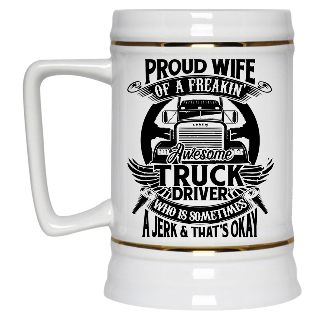 Marry Beer Stein 22oz, Proud Wife Of A Freaking Awesome Truck Driver Beer Mug