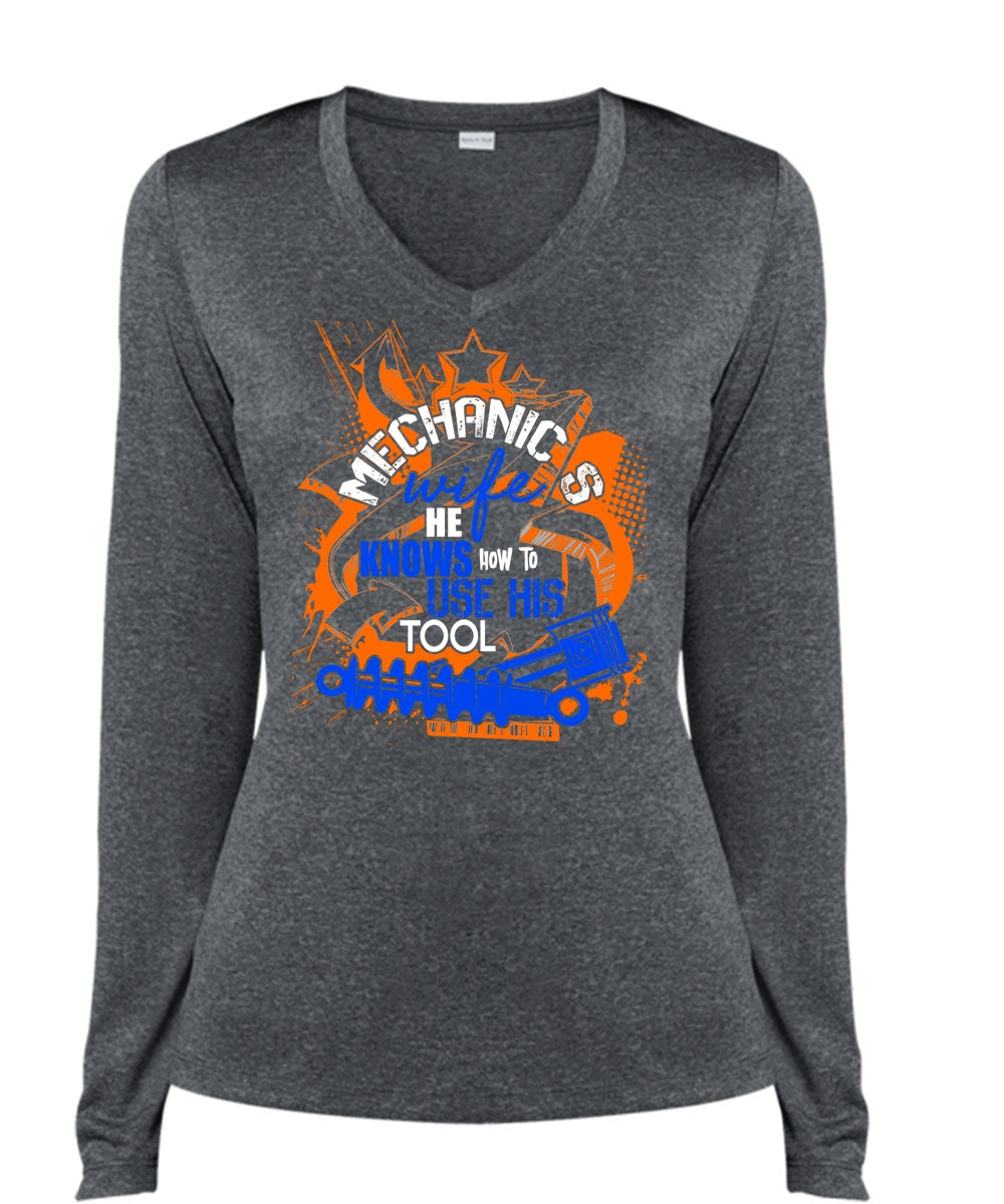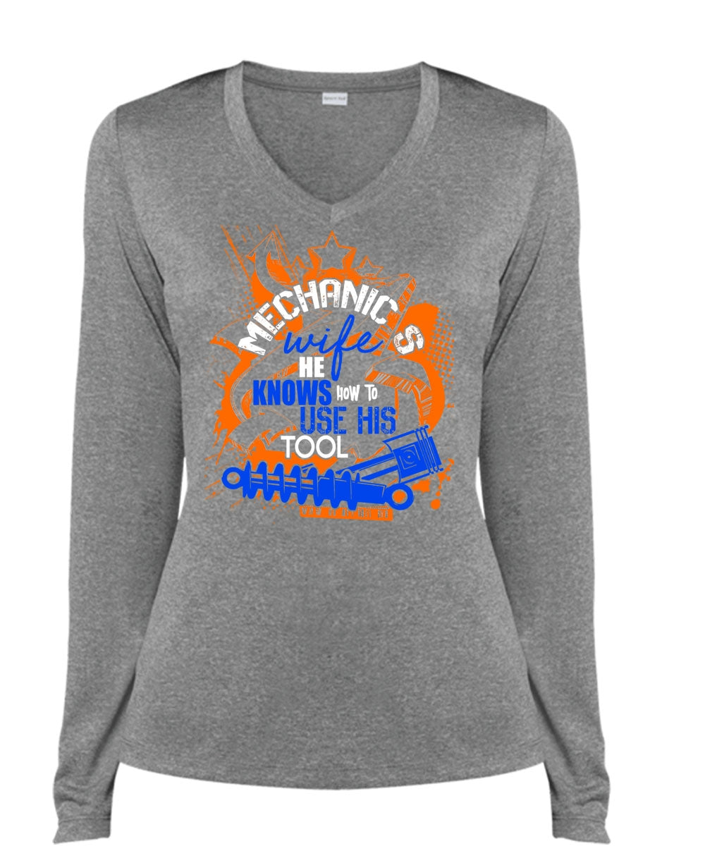 Mechanic's Wife T Shirt, He Knows How To Use His Tool T Shirt, Cool Shirt (Ladies LS Heather V-Neck)