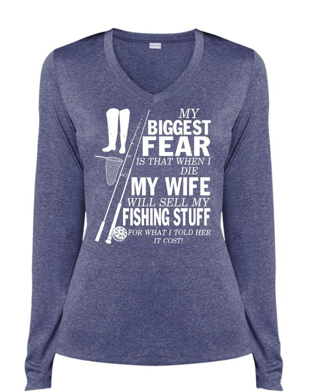 My Biggest Fear T Shirt, My Wife Will Sell My Fishing T Shirt, Cool Shirt (Ladies LS Heather V-Neck)
