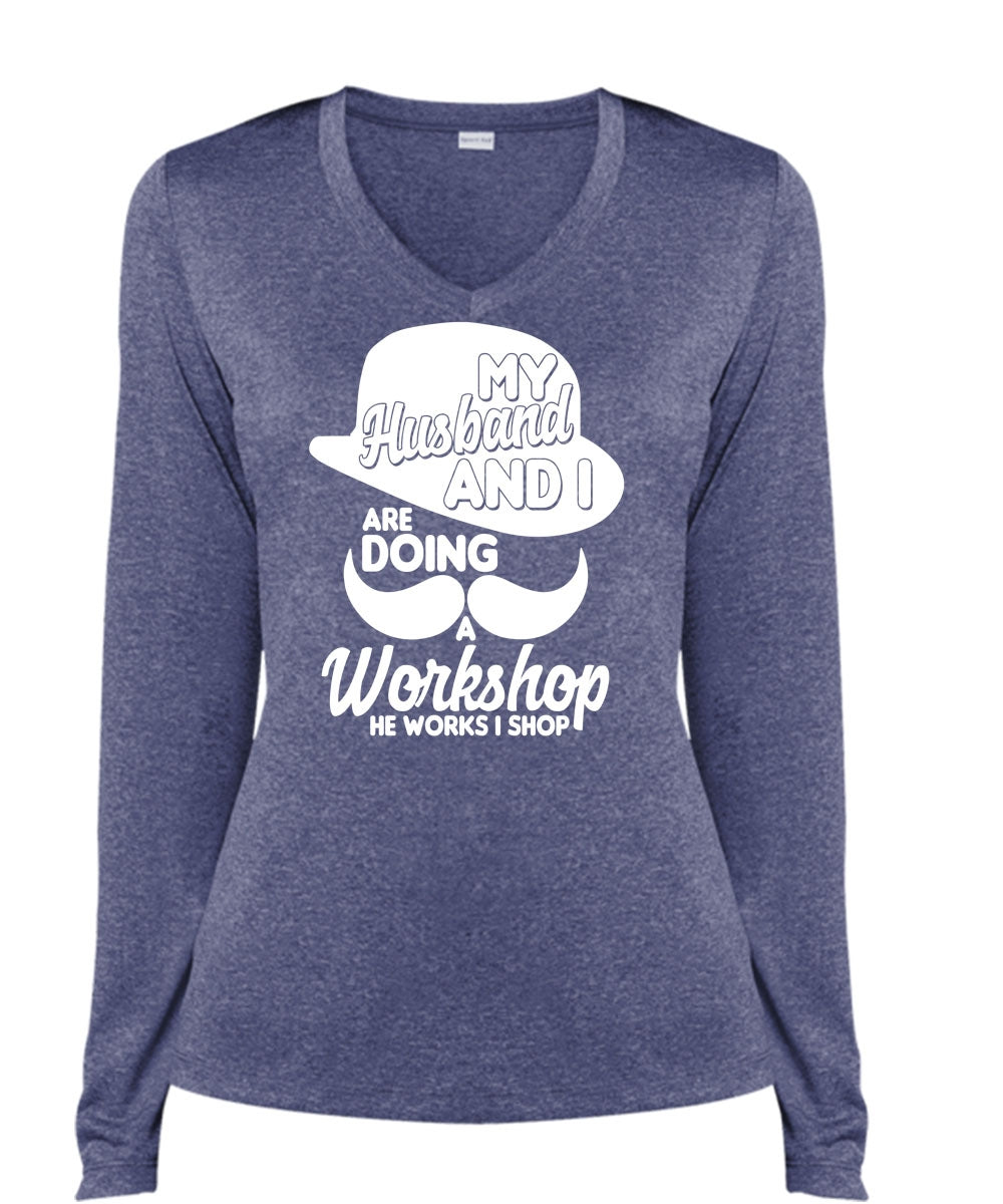 My Husband And I T Shirt, He Works I Shop T Shirt, Cool Shirt (Ladies LS Heather V-Neck)