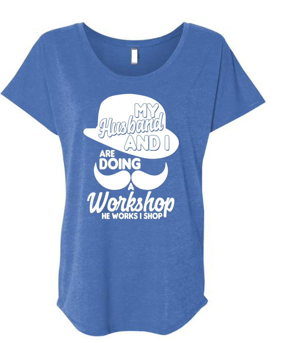 My Husband And I T Shirt, He Works I Shop T Shirt, Cool Shirt (Ladies' Triblend Dolman Sleeve)